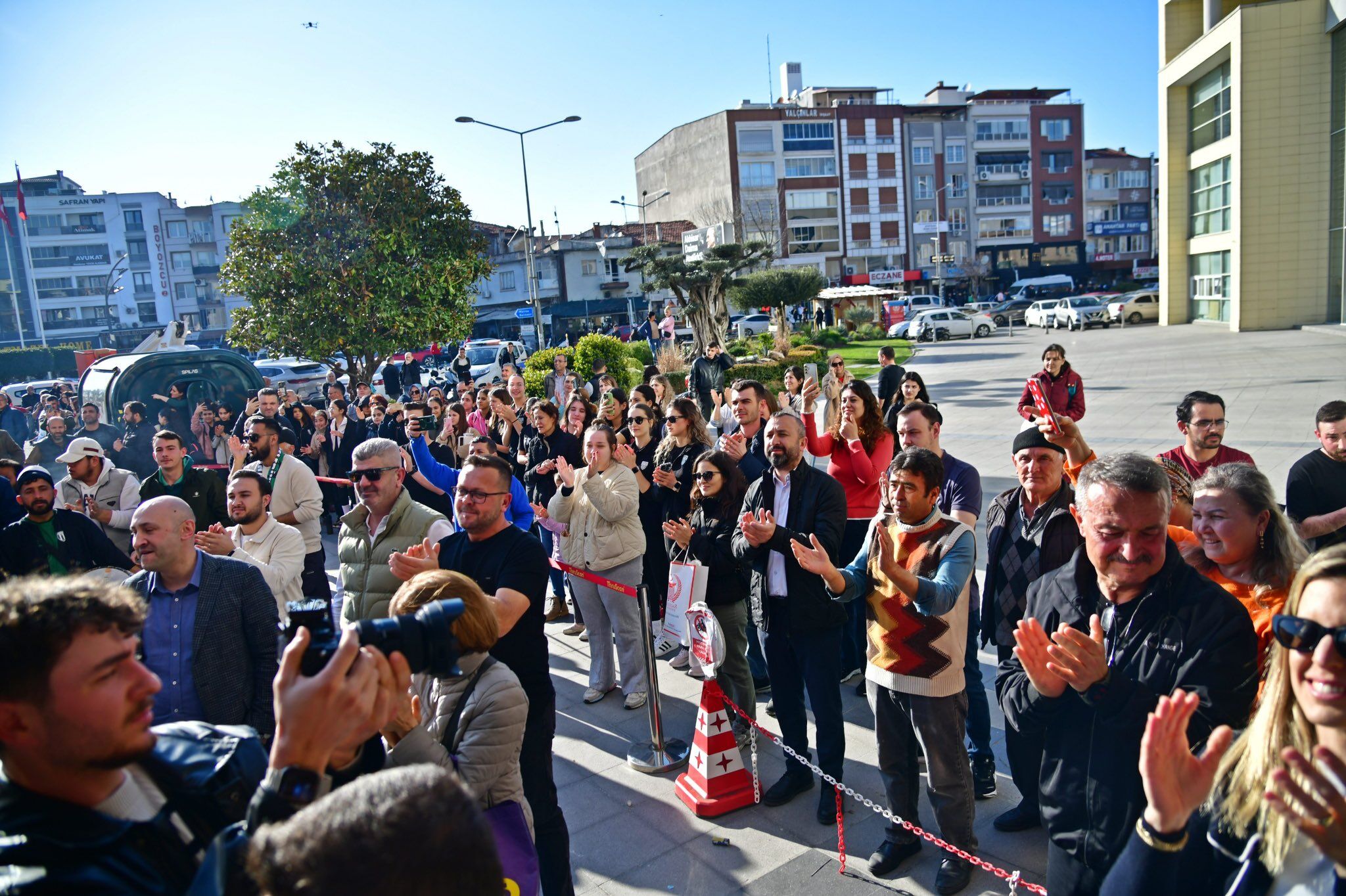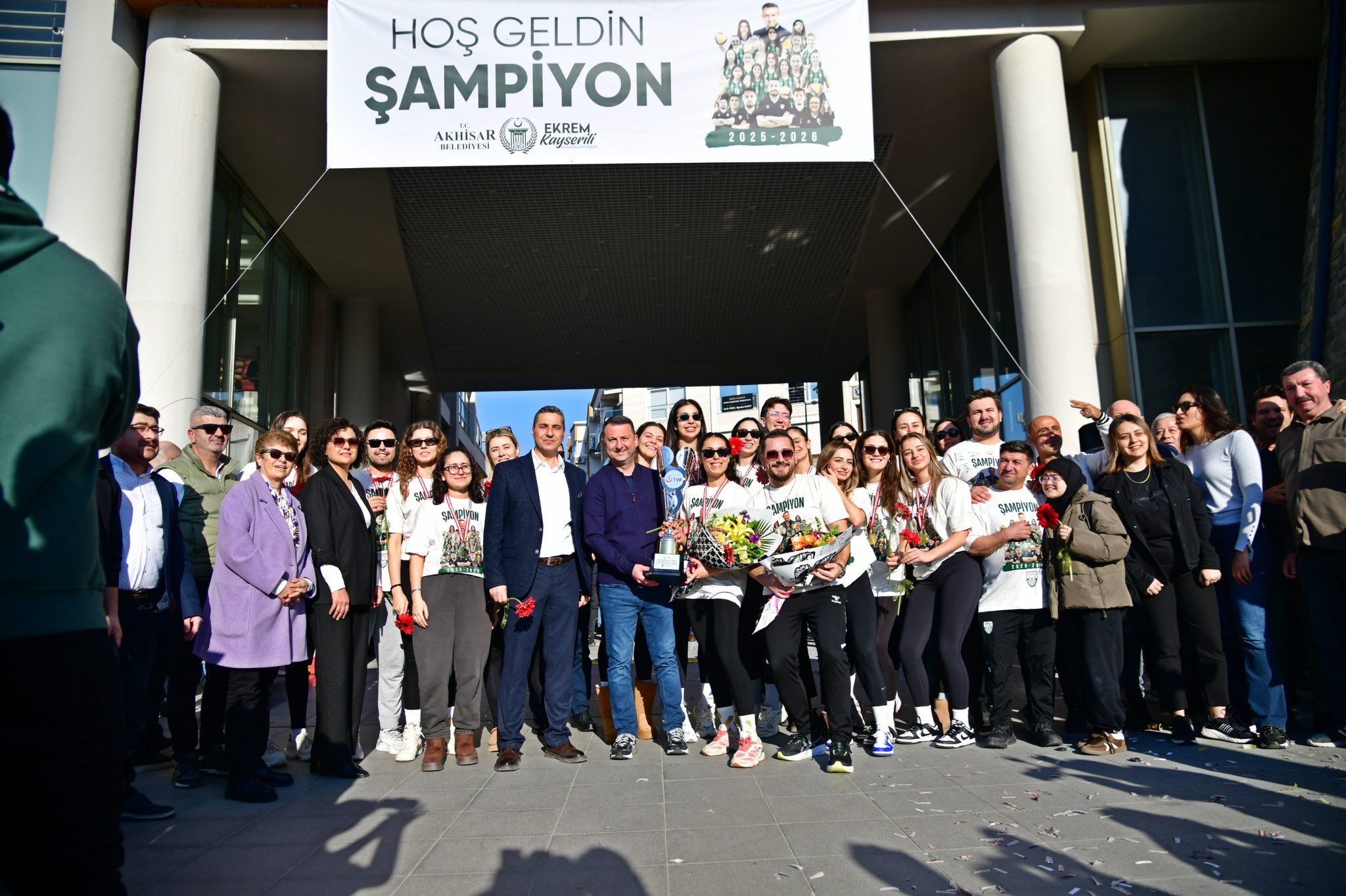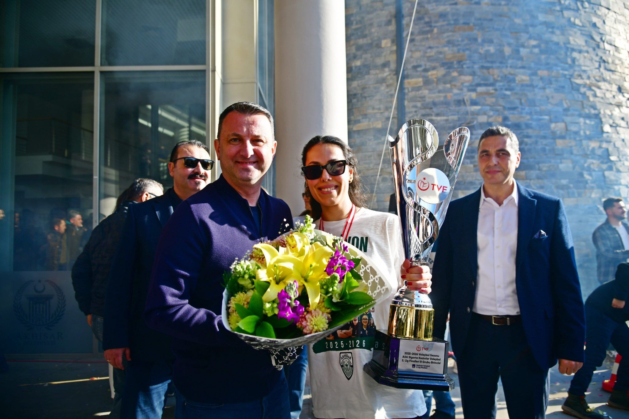 Akhisar Belediyesi önünde düzenlenen programda, Akhisar Belediye Spor Kadın Voleybol Takımı şampiyonluk kupasıyla karşılandı.