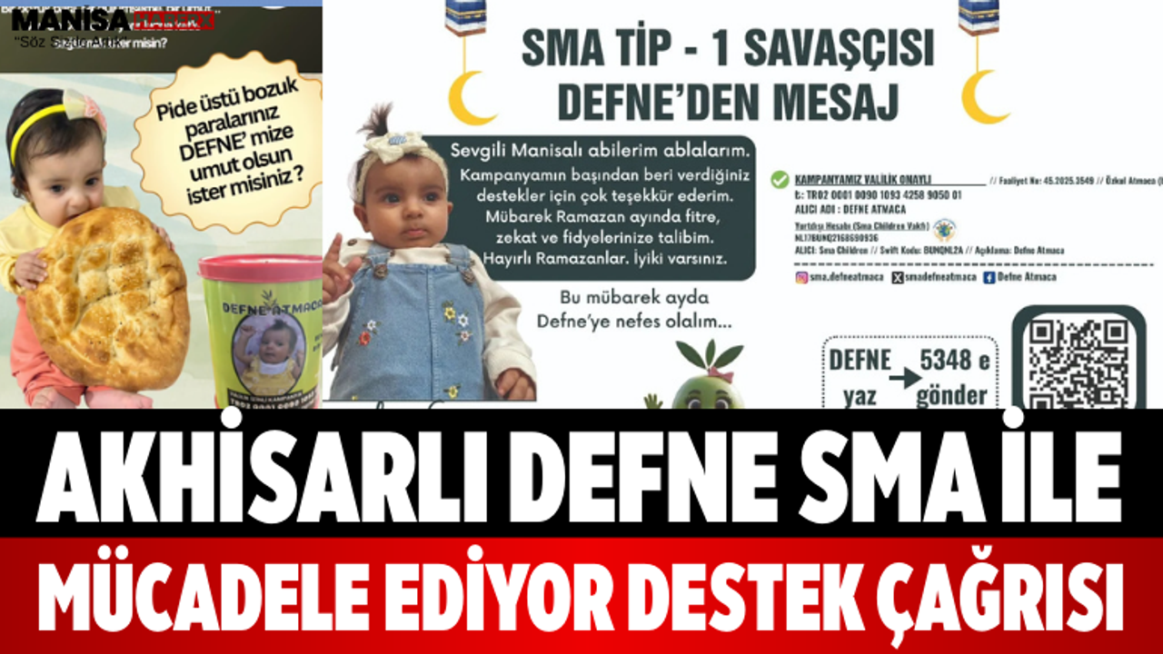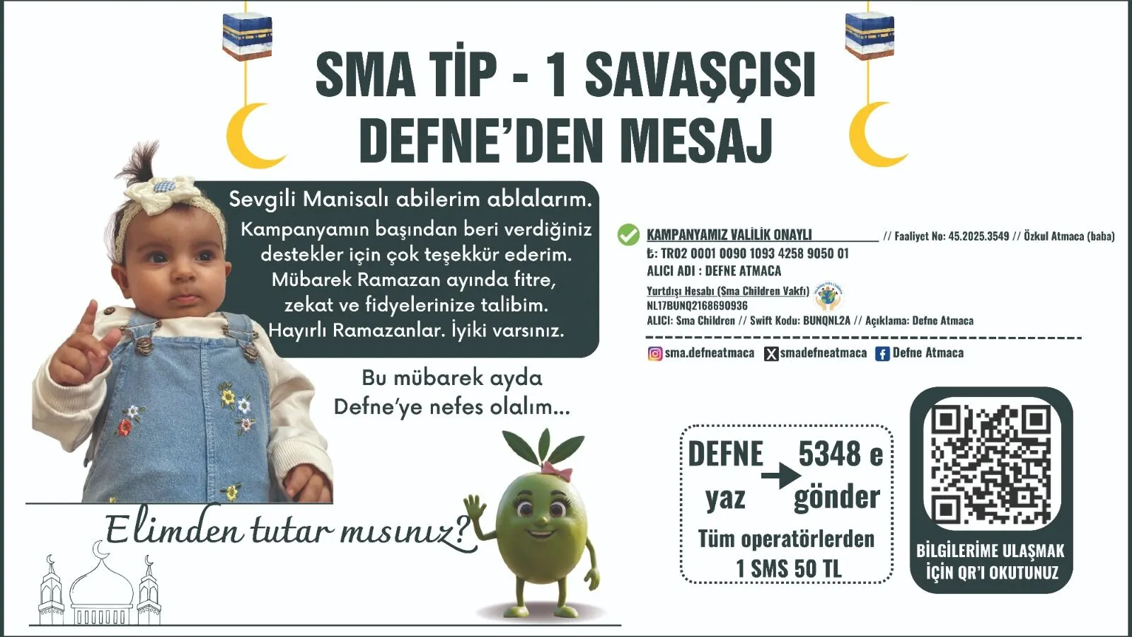 Akhisar’da yaşayan Defne Atmaca’ya Spinal Musküler Atrofi (SMA) Tip-1 teşhisi konuldu. Ailesi, Defne’nin tedavi sürecine destek sağlanması amacıyla valilik onaylı yardım kampanyası başlatıldığını duyurdu.