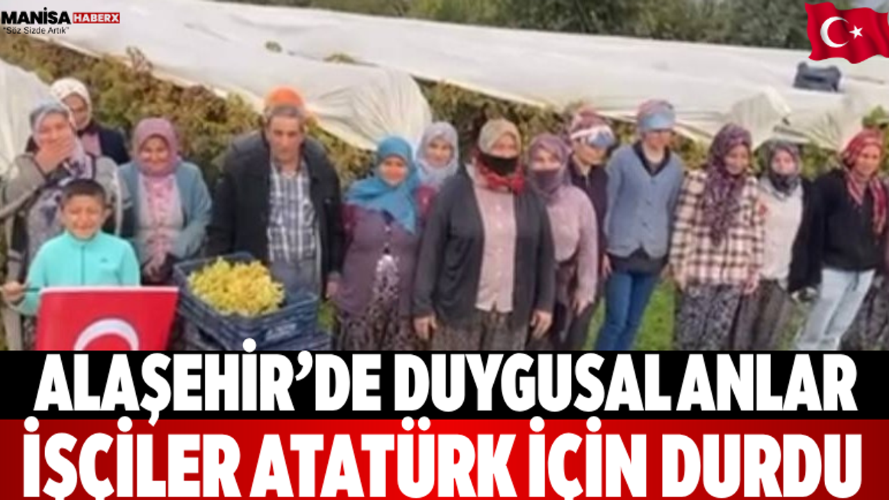 Manisa’nın Alaşehir ilçesinde 10 Kasım Atatürk’ü Anma Günü’nde hem kent merkezinde hem de tarlalarda duygusal anlar yaşandı. İlçe genelinde yapılan resmi törenlerin yanı sıra, üzüm bağlarında çalışan işçiler de