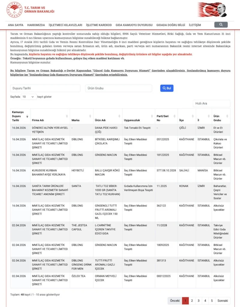 Bakanlık tarafından yapılan bilgilendirmede, açıklanan ürünlerin 2 bin 55’inin taklit veya tağşiş içerdiği, 290 ürünün ise doğrudan insan sağlığını tehdit edebilecek nitelikte olduğu ifade edildi. Liste, “guvenilirgida.tarimorman.gov.tr” adresi üzerinden erişime açıldı.