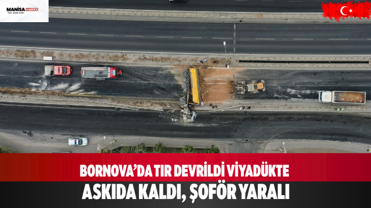 İzmir’in Bornova ilçesinde yağmurun etkisiyle kayganlaşan zeminde kontrolden çıkan taş yüklü tır, viyadük üzerinde devrilerek askıda kaldı.