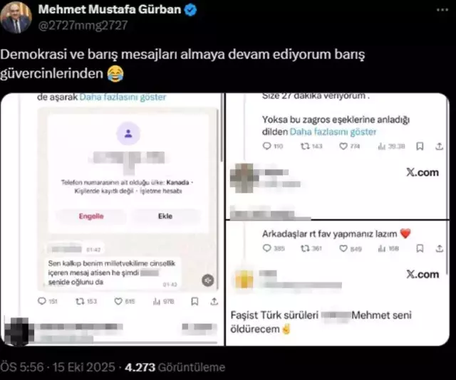 Gürban, gelen mesajların bir bölümünü sosyal medyadan paylaşırken, bazı numaraların yabancı ülke alan kodlarına ait olduğunu belirtti.