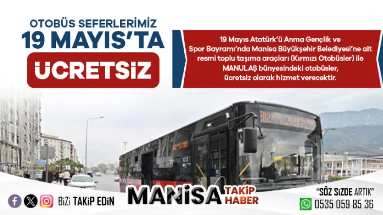 Manisa Büyükşehir Belediyesi, 19 Mayıs Atatürk'ü Anma, Gençlik ve Spor Bayramı’nda Manisalılara ücretsiz toplu taşıma hizmeti sunacak. Manisa Büyükşehir Belediyesi’ne ait resmi toplu taşıma araçları (Kırmızı Otobüsler) ile MANULAŞ bünyesindeki otobüsler, gün boyunca vatandaşları ücretsiz taşıyacak.