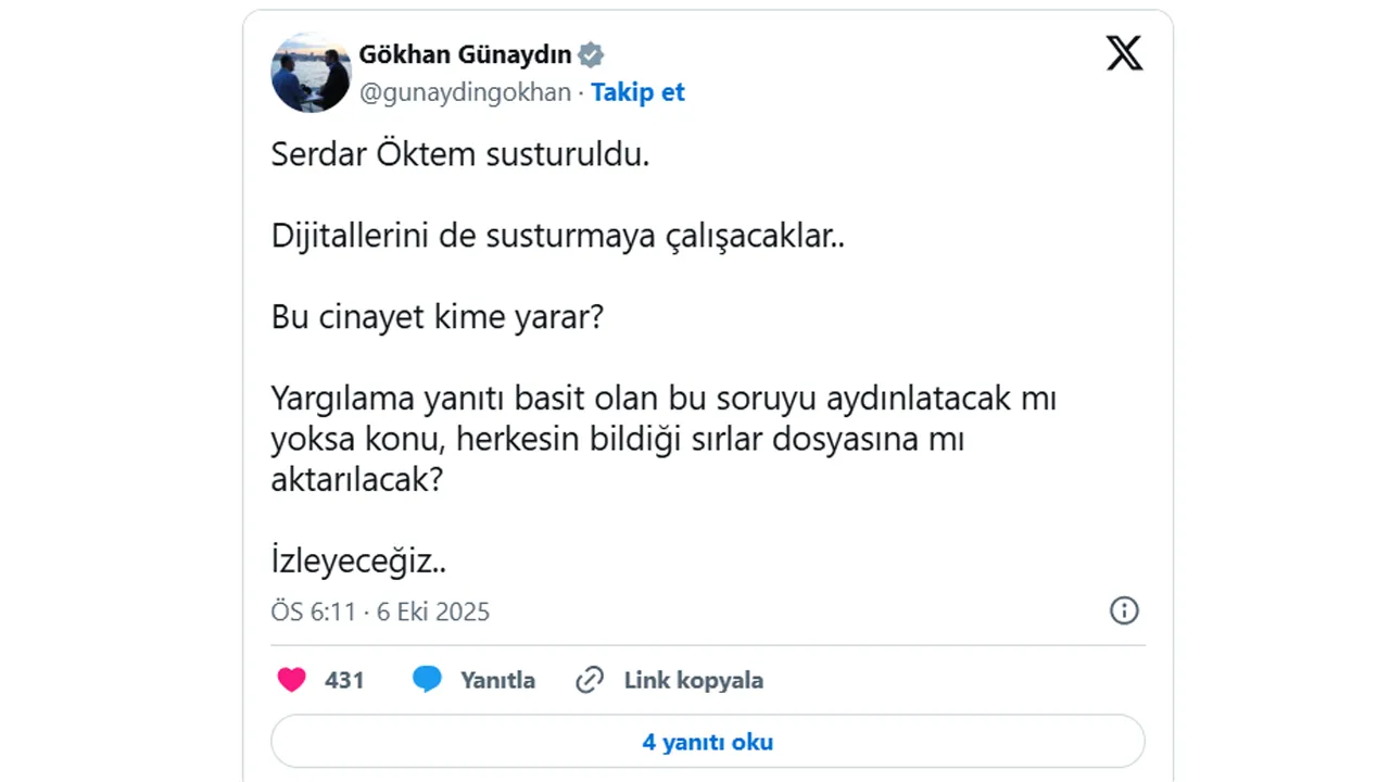 Günaydın, paylaşımında “Serdar Öktem susturuldu. Dijitallerini de susturmaya çalışacaklar. Bu cinayet kime yarar?” ifadelerini kullandı.