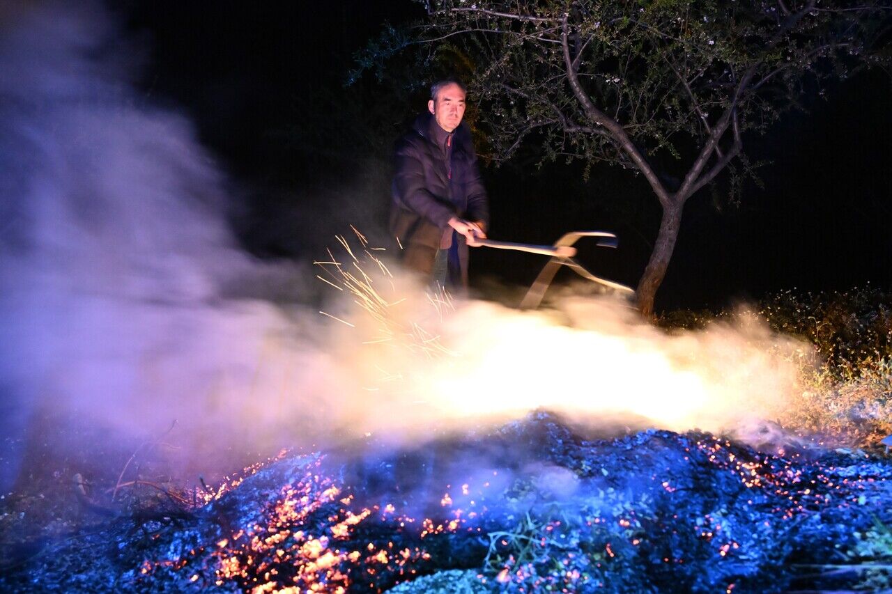 Meteoroloji verilerine göre 11 Nisan tarihine kadar sürmesi beklenen soğuk hava dalgasına karşı çiftçiler, akşam saatlerinden itibaren bahçelerinde dumanlama çalışmalarına başlıyor. Gece boyunca süren bu çalışmalar, sabahın ilk ışıklarına kadar devam ediyor.