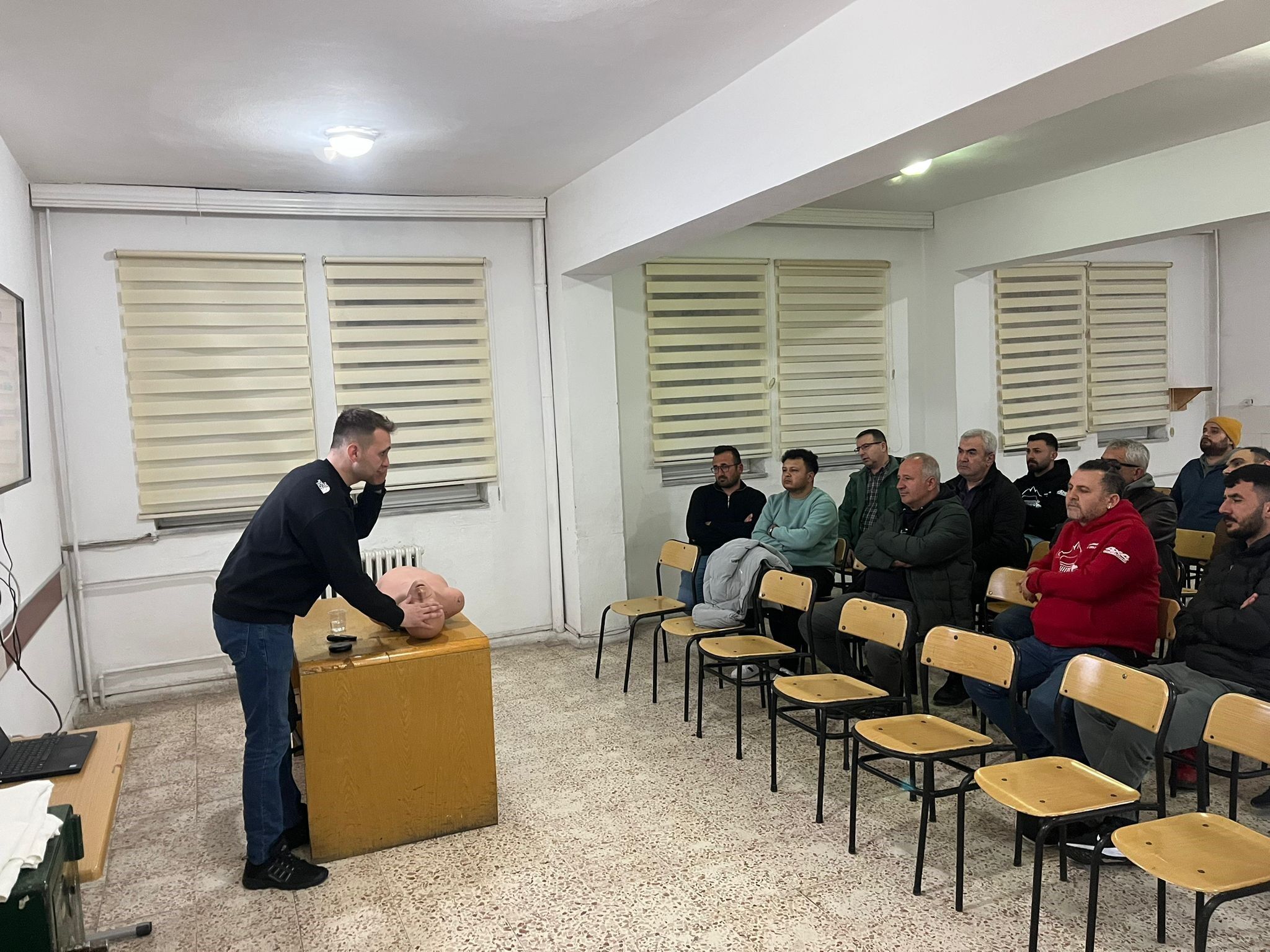 Eğitim programı kapsamında 112 Acil Servis İstasyonu Acil Tıp Teknisyeni (ATT) İbrahim Arga tarafından ilk yardımın temel prensipleri katılımcılara aktarıldı.