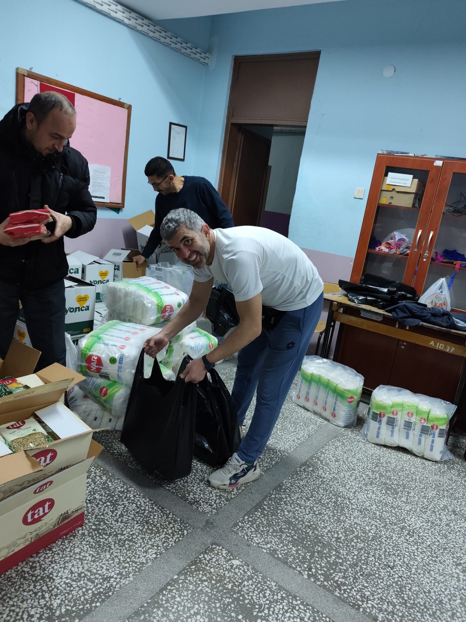 Okulda gerçekleştirilen yardım çalışması kapsamında hazırlanan koliler, ihtiyaç sahibi ailelere teslim edilmek üzere öğrenciler ve öğretmenlerin katılımıyla bölgeye götürüldü.