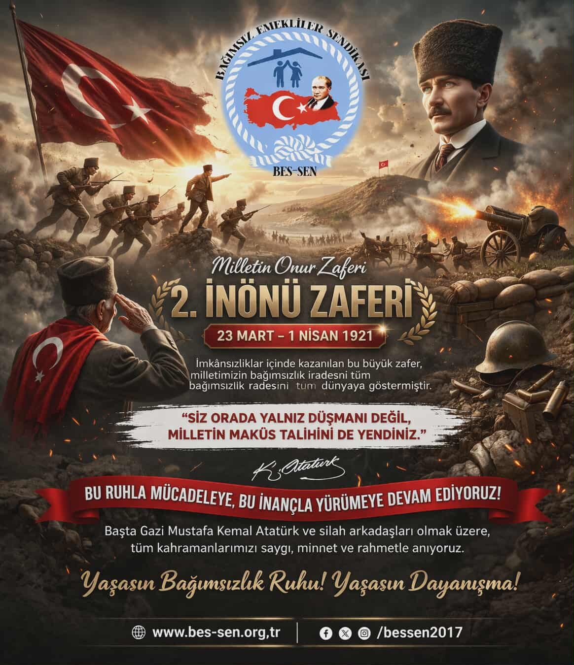 BES-SEN olarak, İkinci İnönü Zaferi’nin onurlu mirasıyla; dün cephede bugün hak mücadelemizde kararlılıkla yürüyoruz.