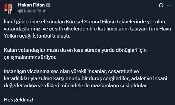 Dışişleri Bakanı Hakan Fidan da sosyal medya hesabından yaptığı paylaşımda, “İsrail güçlerince el konulan Küresel Sumud Filosu teknelerinde yer alan vatandaşlarımızı ve çeşitli ülkelerden filo katılımcılarını taşıyan uçak İstanbul’a ulaştı. Kalan vatandaşlarımızın dönüşü için çalışmalarımız sürüyor. Bu cesur insanlar, insanlığın vicdanı oldular. Hoş geldiniz!” ifadelerini kullandı.