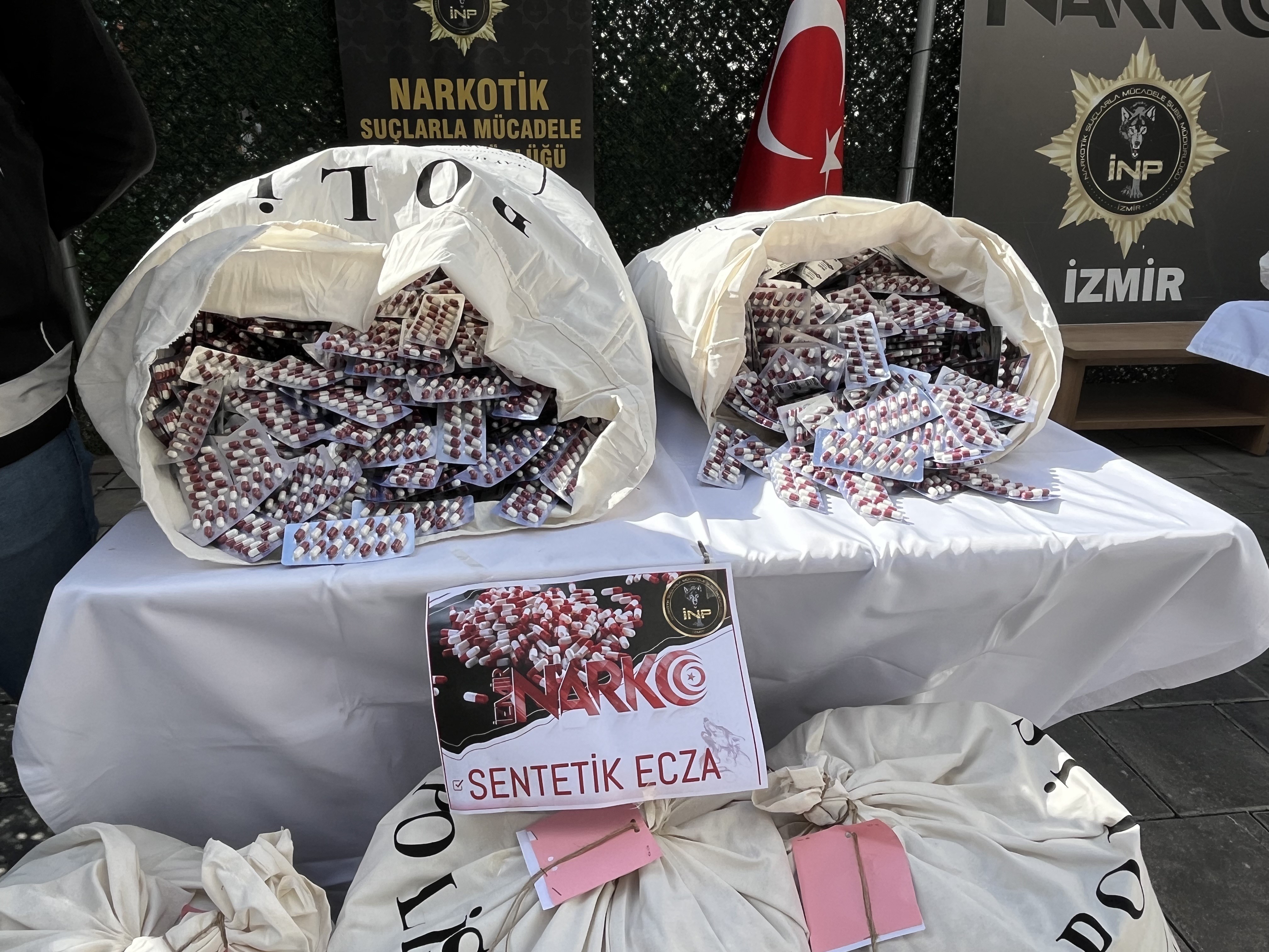 Belirlenen adrese yapılan baskında 881 bin 800 adet sentetik ecza ele geçirildi. Bu miktarın, İzmir’de tek seferde ele geçirilen en yüksek sentetik ecza miktarı olduğu bildirildi.