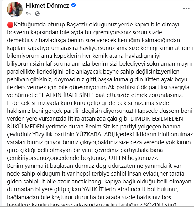 Kula Belediye Başkanı Hikmet Dönmez, sosyal medya hesabından partisinin bazı mensuplarına yönelik sert ifadeler içeren bir paylaşım yaptı. Başkan Dönmez’in paylaşımında, parti içindeki bazı kişilere yönelik eleştiriler ve sert benzetmeler yer aldı. Paylaşım kısa sürede sosyal medyada yayılarak ilçede ve partide tartışma başlattı.