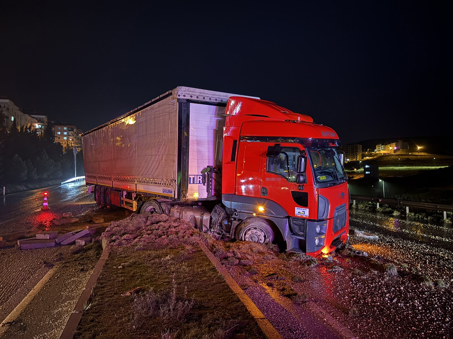 Edinilen bilgilere göre, Mahsun Ç. idaresindeki 33 AYY 788 plakalı tır, yağışlı havanın etkisiyle kayganlaşan yolda sürücüsünün direksiyon hakimiyetini kaybetmesi sonucu kontrolden çıktı. Araç, yol kenarındaki refüje çıkarak durabildi.