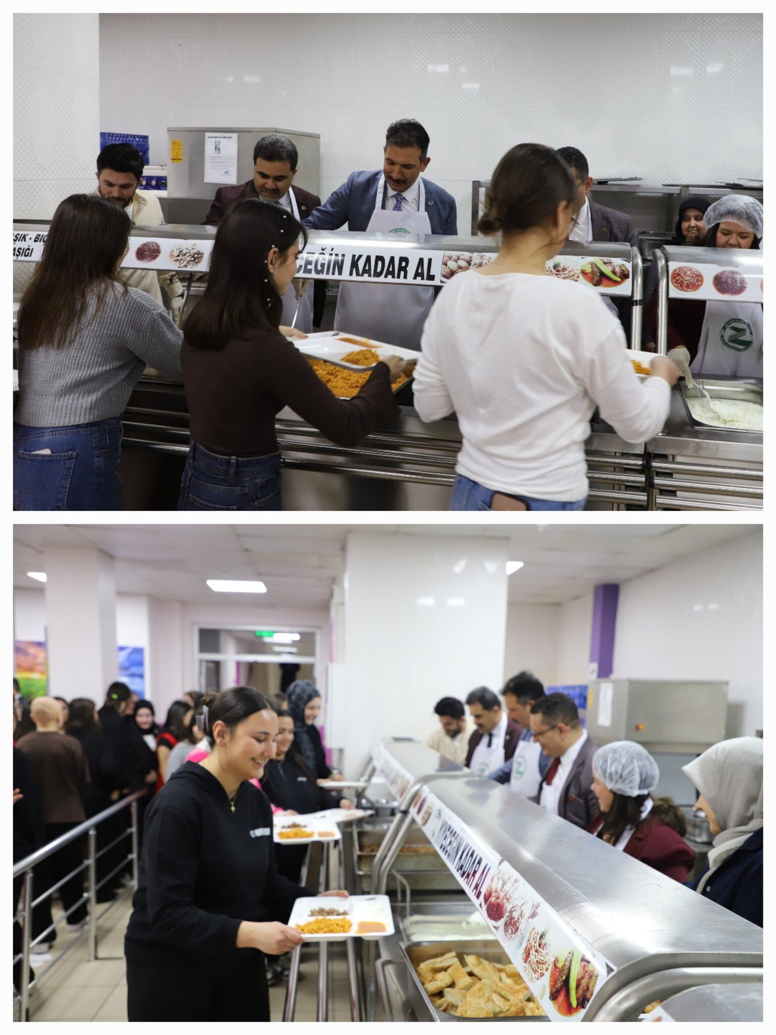 Kazanların başına geçerek öğrencilere yemek dağıtımı yaptı,