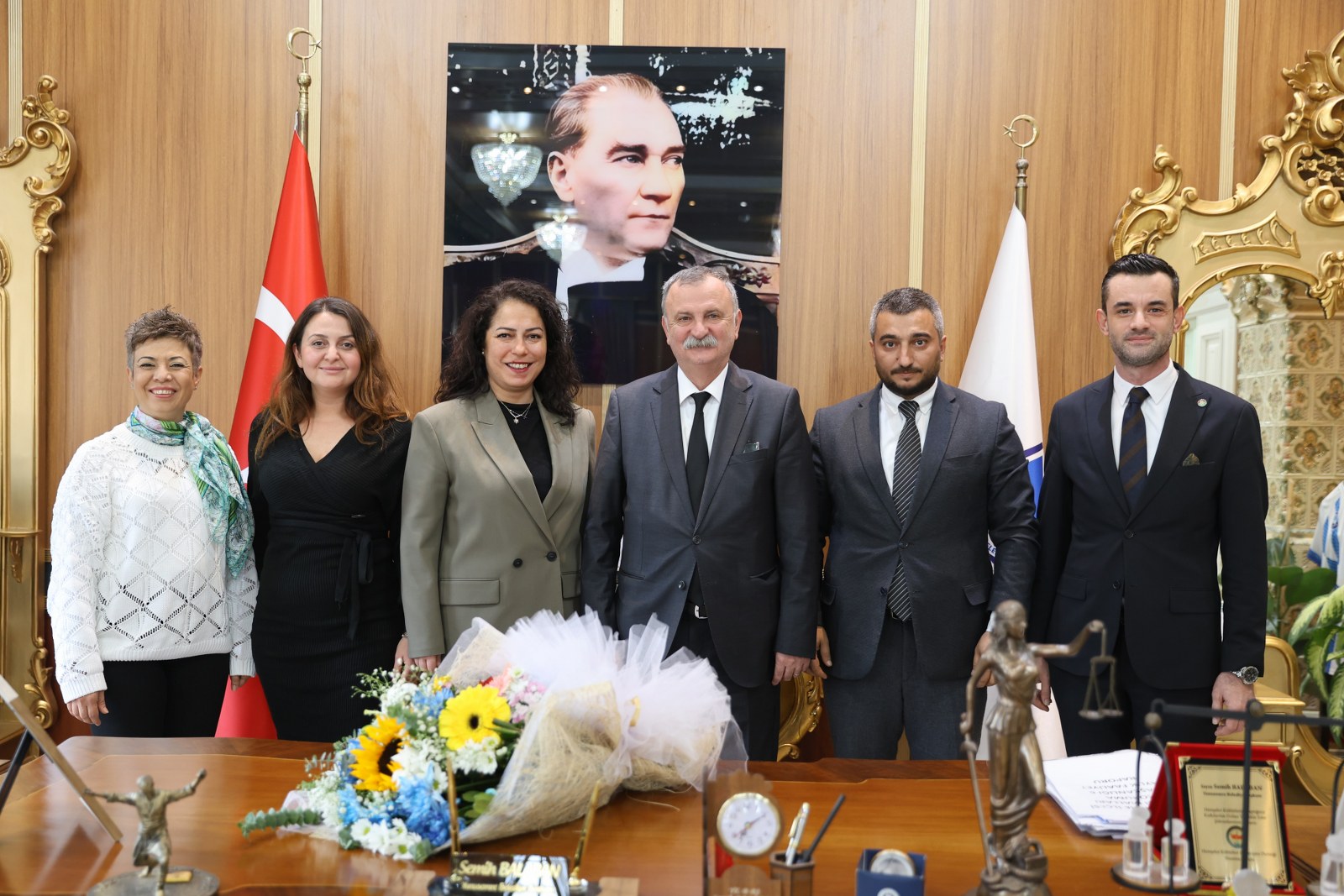 Başkan Balaban’a ziyarette kendileri de avukat olan Belediye Başkan Yardımcısı Emine Özge Arslan ile Hukuk İşleri Müdürü Cemile Uysal eşlik etti. Baro yönetimi, yürütülen projeler ve kurumlar arası olası iş birliği alanlarını görüşme imkânı buldu.