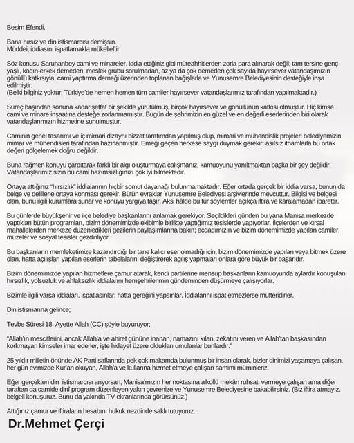 Manisa’da Saruhanbey Camii üzerinden yaşanan tartışmalarla ilgili eski Yunusemre Belediye Başkanı Mehmet Çerçi açıklamada bulundu. Çerçi, kendisine yöneltilen “hırsızlık” ve “din istismarı” iddialarına sert ifadelerle yanıt verdi.