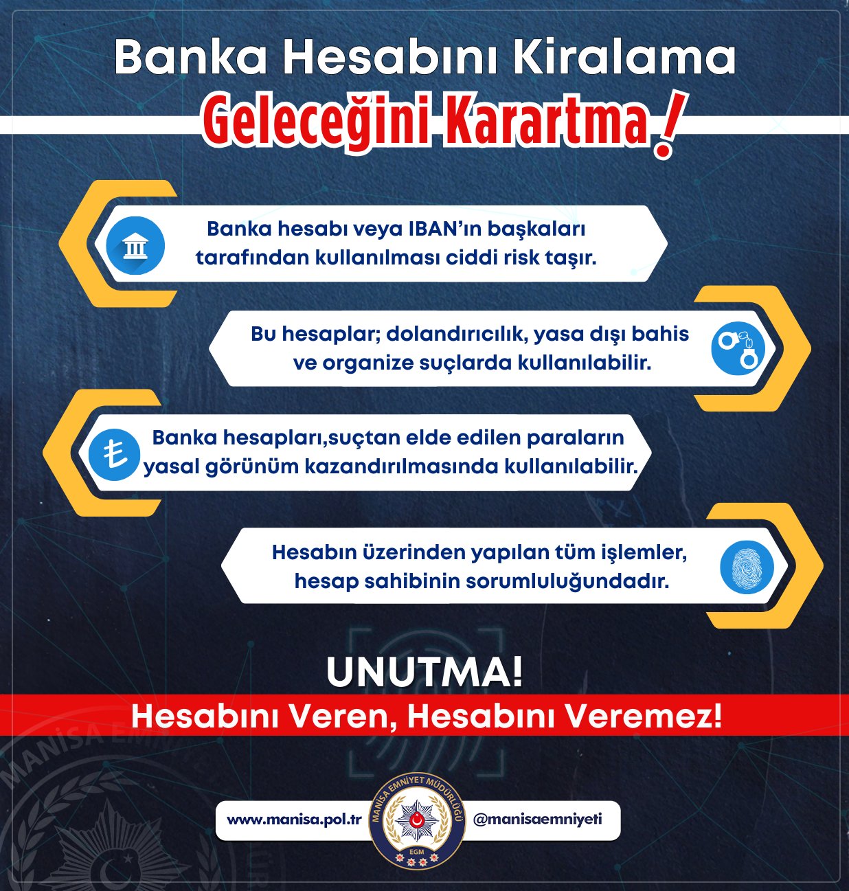 Manisa İl Emniyet Müdürlüğü, son dönemde artış gösteren banka hesabı kiralama yöntemine karşı vatandaşlara uyarıda bulundu. Yapılan bilgilendirmede, IBAN numarasının başka kişilere kullandırılmasının ciddi hukuki sonuçlar doğurabileceği belirtildi.