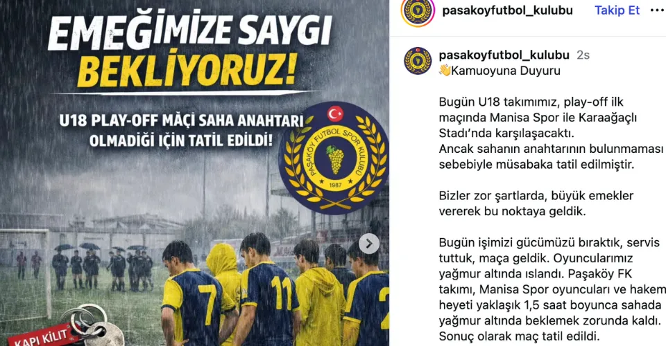 Manisa’da oynanması planlanan U18 play-off karşılaşması, saha anahtarının bulunamaması nedeniyle tatil edildi. Manisaspor ile Paşaköy Futbol Kulübü arasında Karaağaçlı Stadı’nda oynanması planlanan mücadele, organizasyon eksikliği nedeniyle gerçekleştirilemedi.