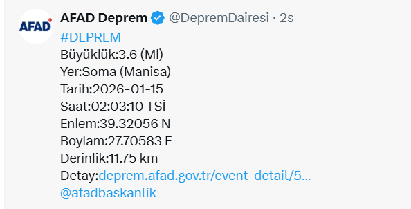 Manisa’nın Soma ilçesi merkez üssü olarak 3,6 büyüklüğünde bir deprem meydana geldi. AFAD’dan yapılan açıklamaya göre sarsıntı, 02:03 saatlerinde yaşandı. Deprem kısa süreli paniğe yol açarken, can ve mal kaybı ile ilgili henüz olumsuz bir ihbar alınmadığı bildirildi.