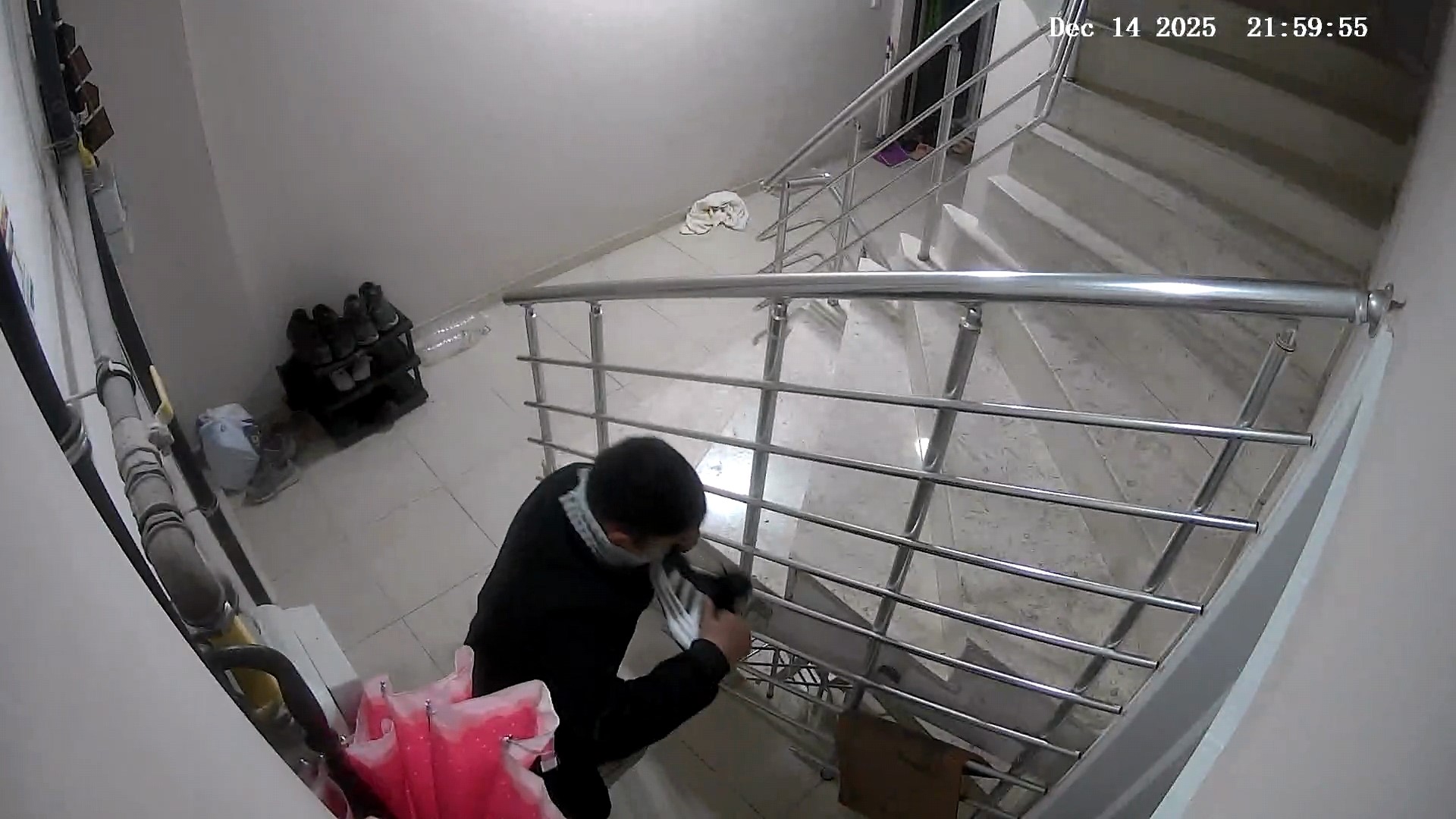 Güvenlik kamerası görüntülerinde şüpheli şahsın, kimliğinin tespit edilmemesi amacıyla maske taktığı dikkat çekti. Şahsın kısa sürede apartman önlerinde bulunan ayakkabıları alarak olay yerinden uzaklaştığı görüldü.