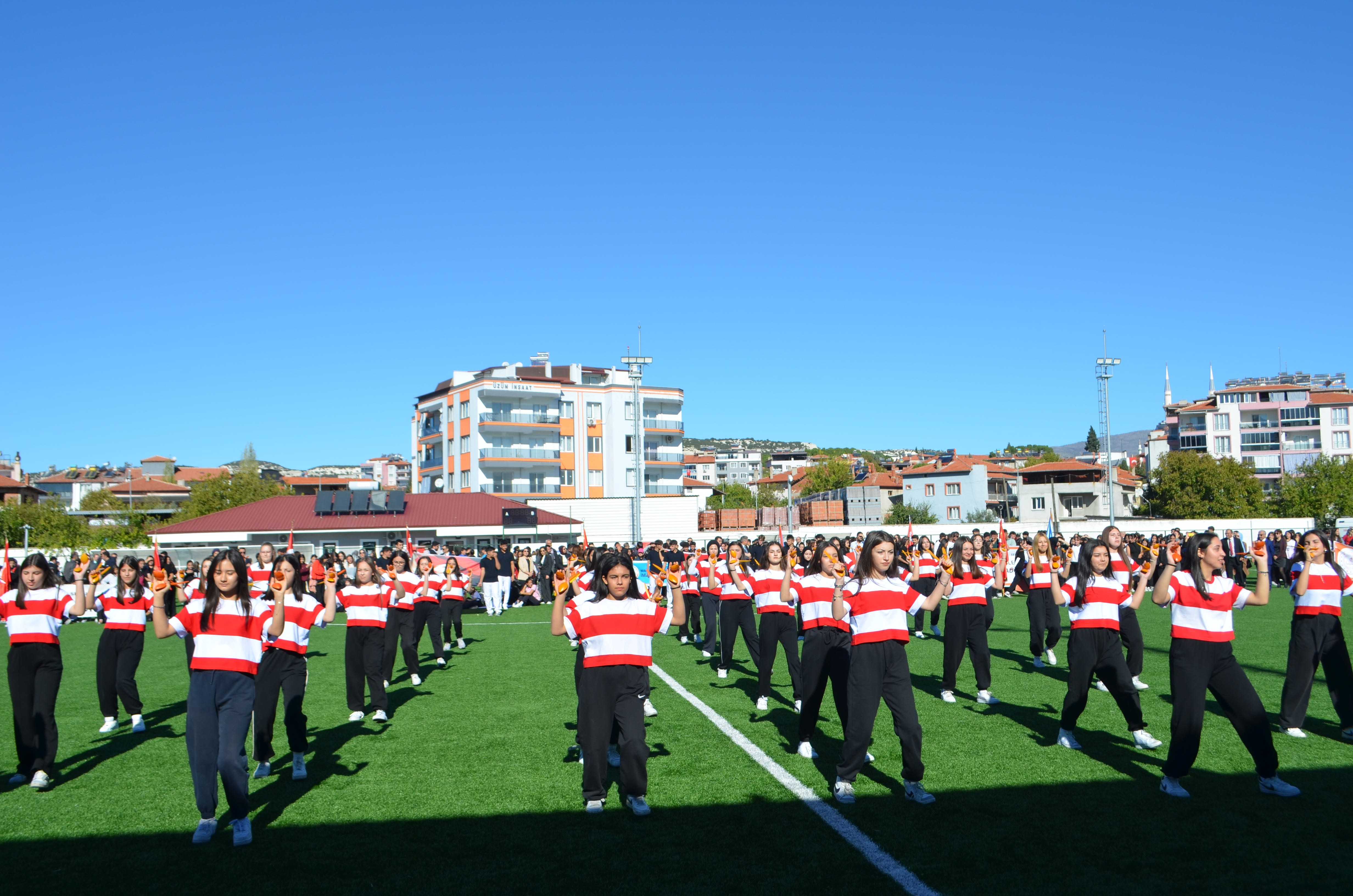 Öğrenciler, şiirler okudu ve müzikli gösterilerle sahne aldı. Gevher Nesibe Mesleki ve Teknik Anadolu Lisesi ile 75. Yıl Alime Paşa Ortaokulu öğrencileri, stadda 102 ve Ayyıldız koreografisini bedenleriyle çizerek büyük alkış aldı. Tören kapsamında düzenlenen okullar arası yarışmalarda dereceye giren öğrencilere Kaymakam Fatih Bayram, Belediye Başkanı Erkan Kara ve Garnizon Komutanı Mly. Binbaşı Hüseyin Cihan Korkmaz tarafından ödülleri takdim edildi.
