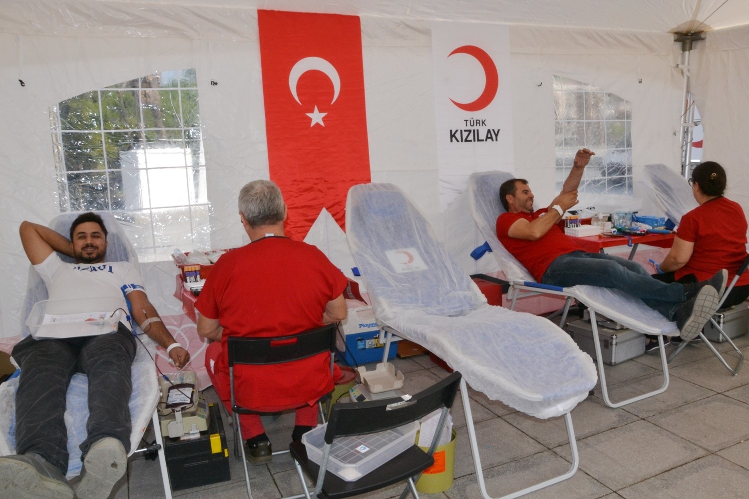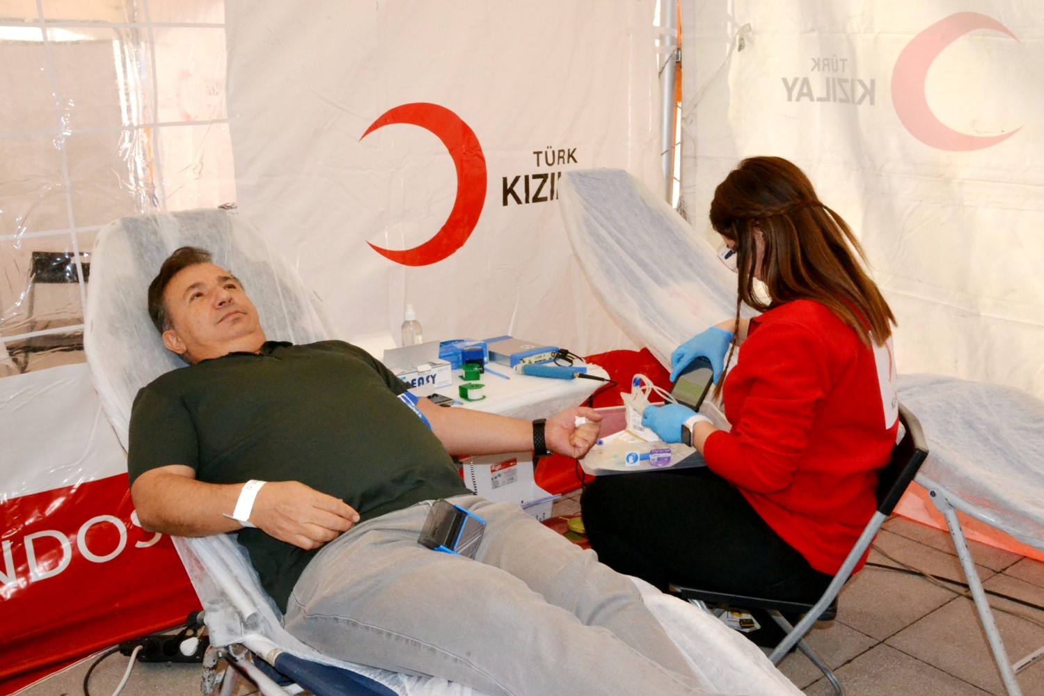 Cumhuriyet Meydanı’nda kurulan kan bağışı alanında sabah saatlerinden itibaren yoğunluk yaşandı.