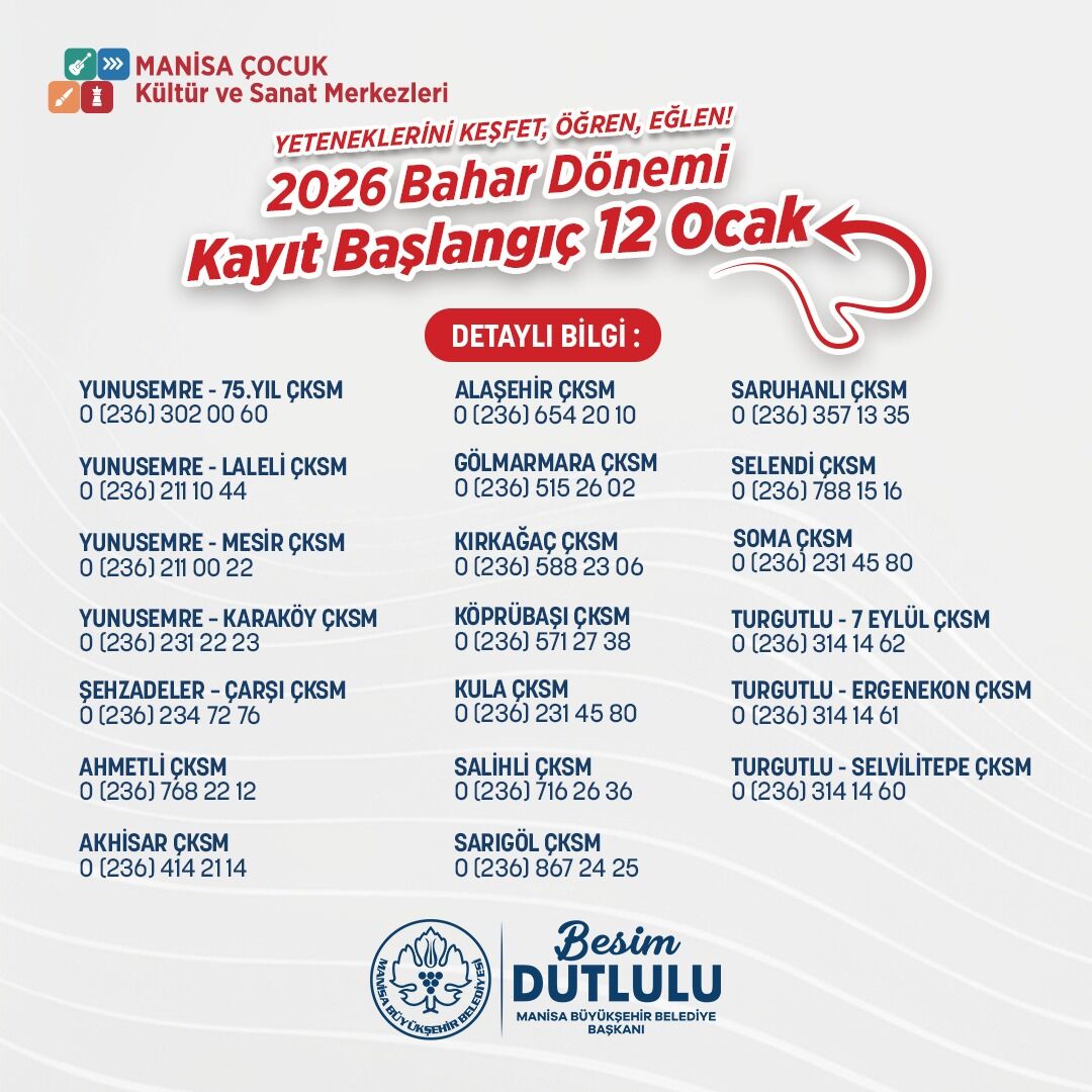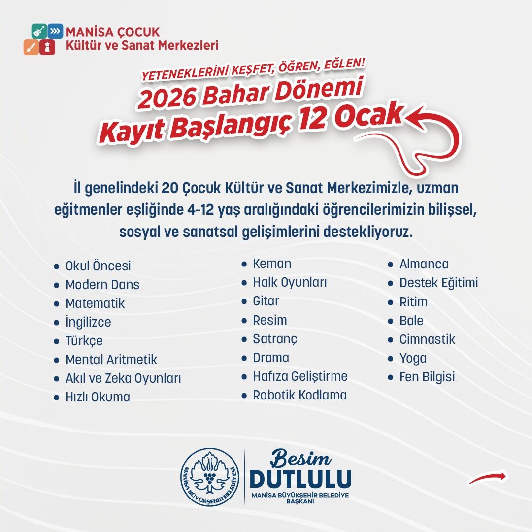 Manisa Büyükşehir Belediyesi bünyesinde faaliyet gösteren Çocuk Kültür ve Sanat Merkezleri’nde (ÇKSM) 2026 yılı bahar dönemi kayıt süreci başladı. 12 Ocak tarihi itibarıyla başlayan kayıtlar, Manisa genelinde hizmet veren 20 merkezde gerçekleştiriliyor. Kayıtların hem yeni başvurular hem de mevcut öğrenciler için yenileme işlemlerini kapsadığı bildirildi.