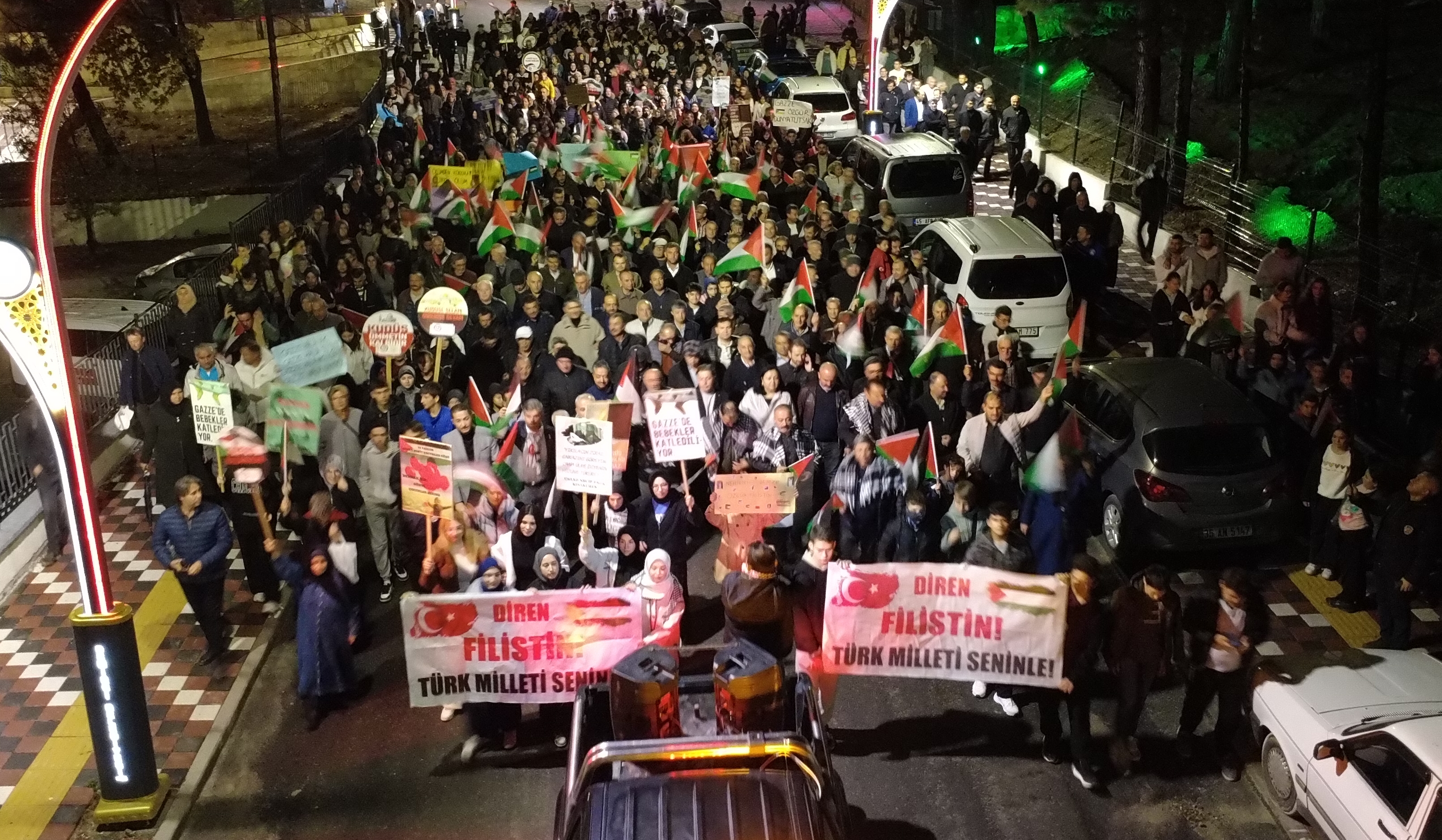 Demirci Belediyesi ve Filistin’e Destek Platformu tarafından düzenlenen yürüyüş için katılımcılar yatsı namazının ardından Sultan Abdülhamid Han Camisi önünde toplandı. Ellerinde Türk ve Filistin bayrakları taşıyan vatandaşlar, sağanak yağış altında İsrail aleyhine sloganlar attı ve tekbir getirdi.