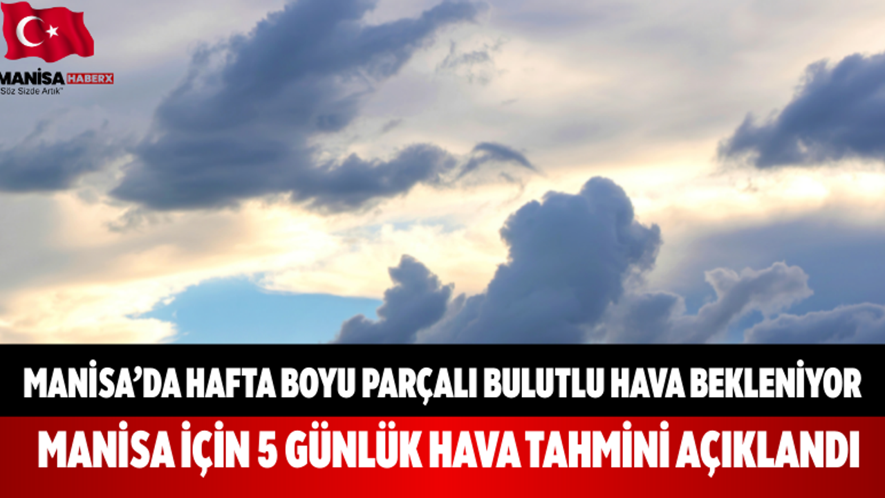 Meteoroloji Genel Müdürlüğü’nün yayımladığı 5 günlük hava tahmin raporuna göre Manisa’da bugün çok bulutlu ve yer yer açık hava etkili olacak. Kent genelinde hafta boyunca parçalı bulutlu bir hava bekleniyor.