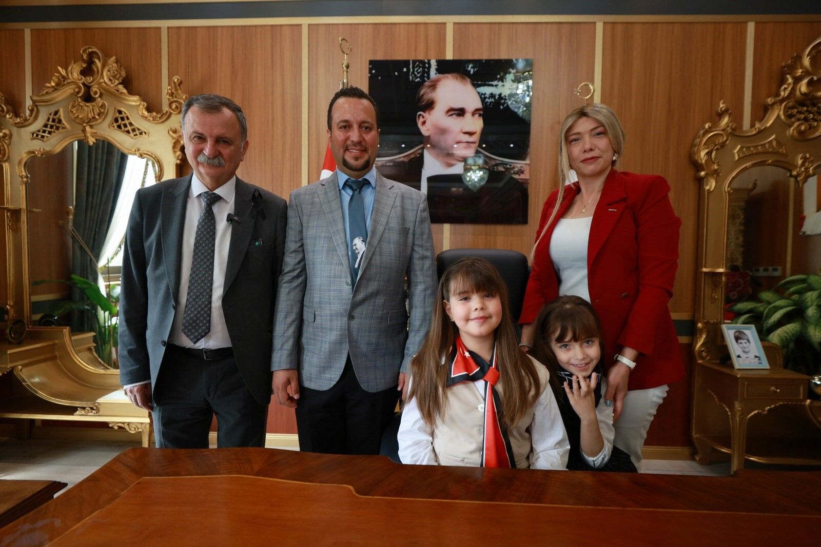 Başkan Hakan Şimşek, makam koltuğunu İstiklal İlkokulu öğrencisi Janset Nare Oğuz ve Ahmet Tütüncüoğlu İlkokulu öğrencisi Deniz Ege Kılınç’a devretti.