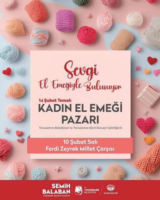 Yunusemre Belediyesi yetkilileri, sevgisini anlamlı bir hediyeyle göstermek isteyen tüm vatandaşları 10 Şubat Salı günü Ferdi Zeyrek Millet Çarşısı’nda kurulacak 14 Şubat Temalı Kadın El Emeği Pazarı’na davet etti.