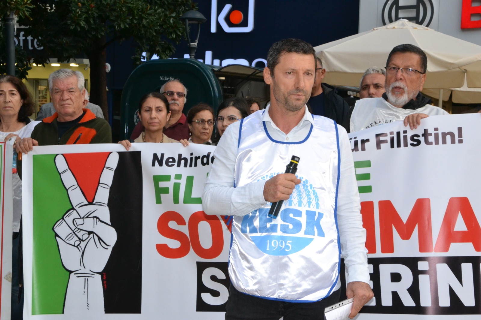 Manisa Emek Demokrasi ve Barış Platformu üyeleri, 15 Temmuz Demokrasi Meydanı’nda bir araya gelerek Filistin halkına destek verdi. Katılımcılar, “Nehirden denize özgür Filistin” ve “Filistin’de soykırıma son” yazılı pankartlar açtı.