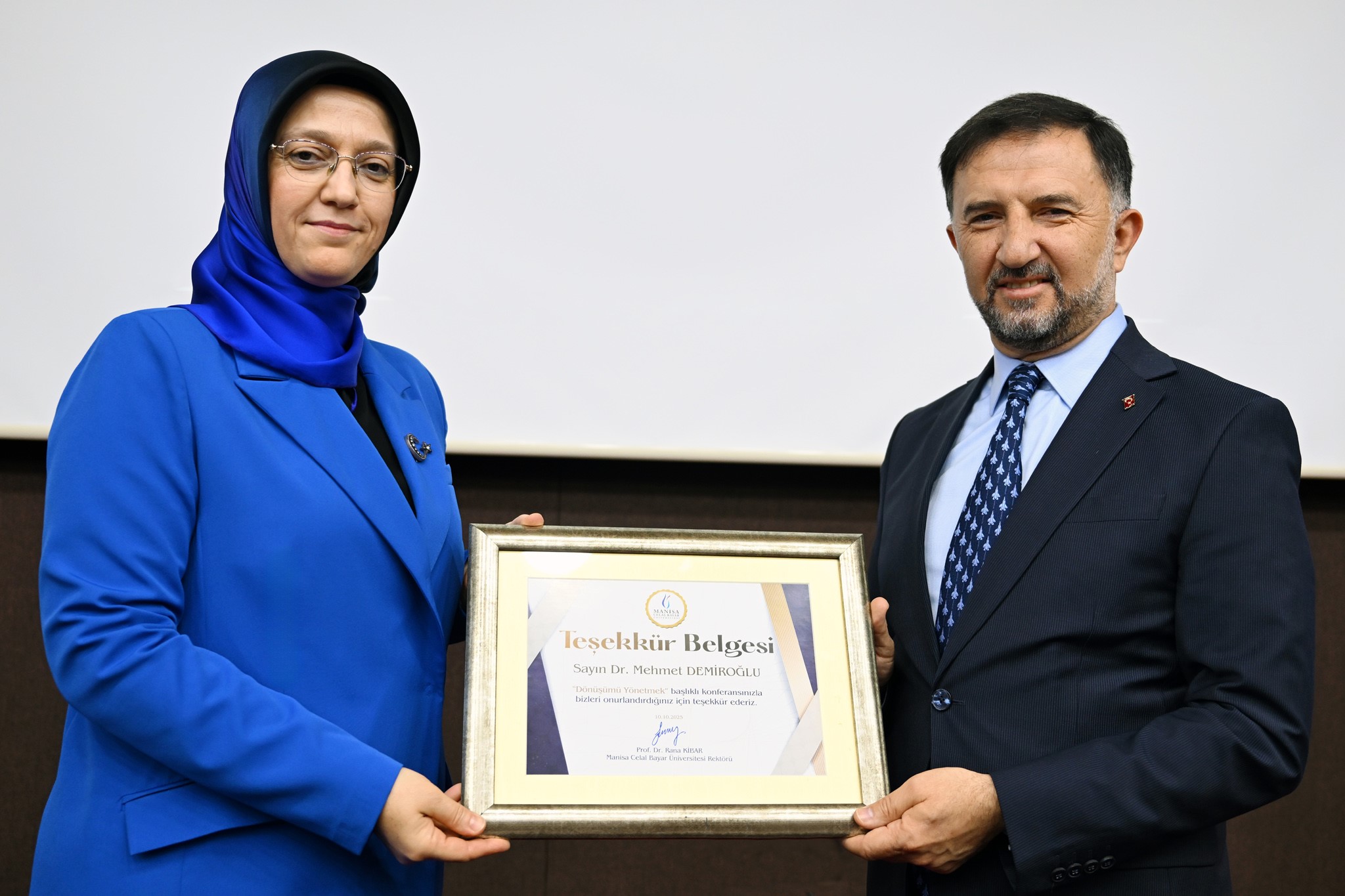Konferansın sonunda Rektör Kibar, Dr. Demiroğlu’na katkılarından dolayı teşekkür ederek günün anısına teşekkür plaketi takdim etti.