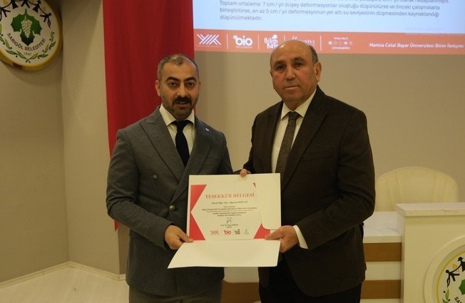 Manisa Celal Bayar Üniversitesi (MCBÜ) Bilim İletişim Ofisi öncülüğünde düzenlenen Bilim Kafe etkinlikleri kapsamında Sarıgöl Bölgesi’nin tektonik yapısı ve yüzey deformasyonları ele alındı. Program, Sarıgöl Belediyesi Konferans Salonu’nda gerçekleştirildi.