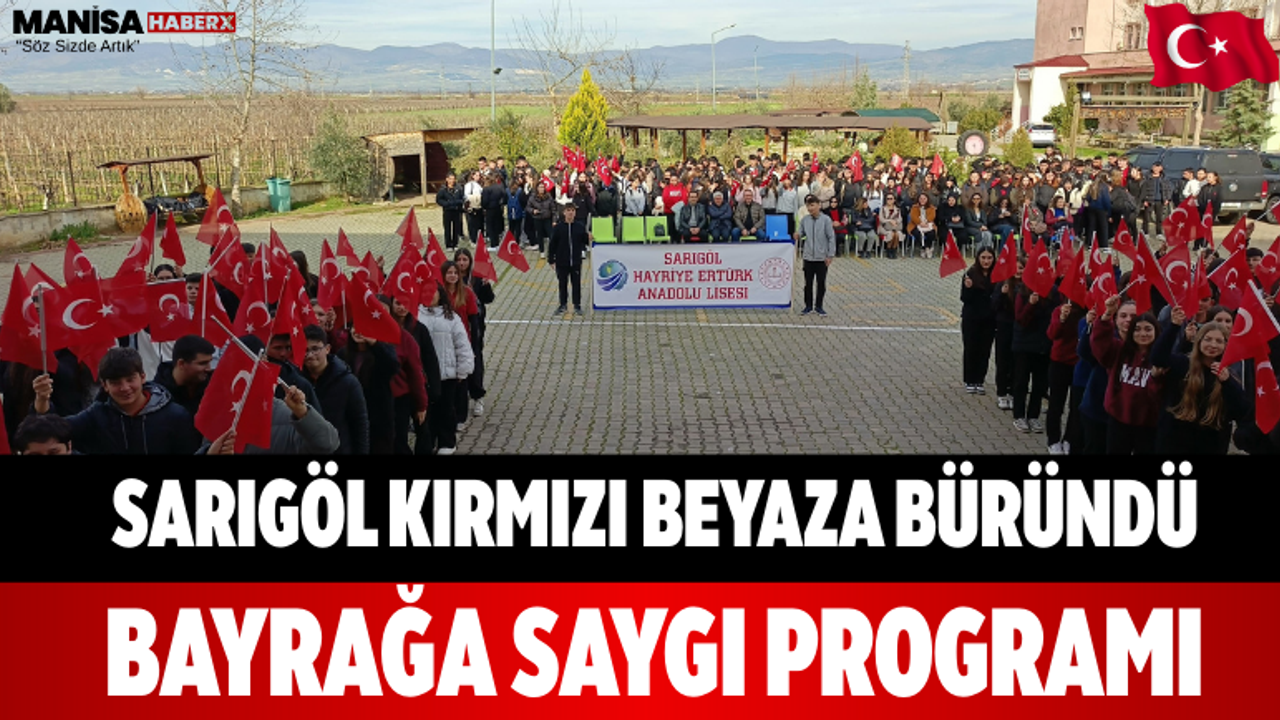 Bu kapsamda Sarıgöl Hayriye Ertürk Anadolu Lisesi tarafından “Bayrağa Saygı ve Sevgi” programı düzenlendi. Okul yönetimi ve öğretmenlerin koordinasyonunda gerçekleştirilen etkinlikte öğrenciler, yanlarında getirdikleri Türk bayraklarıyla programa katıldı.