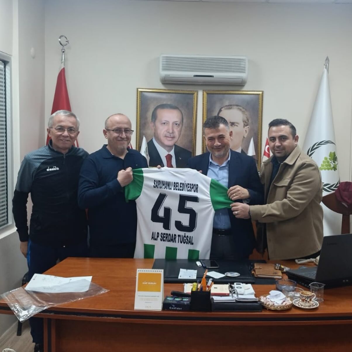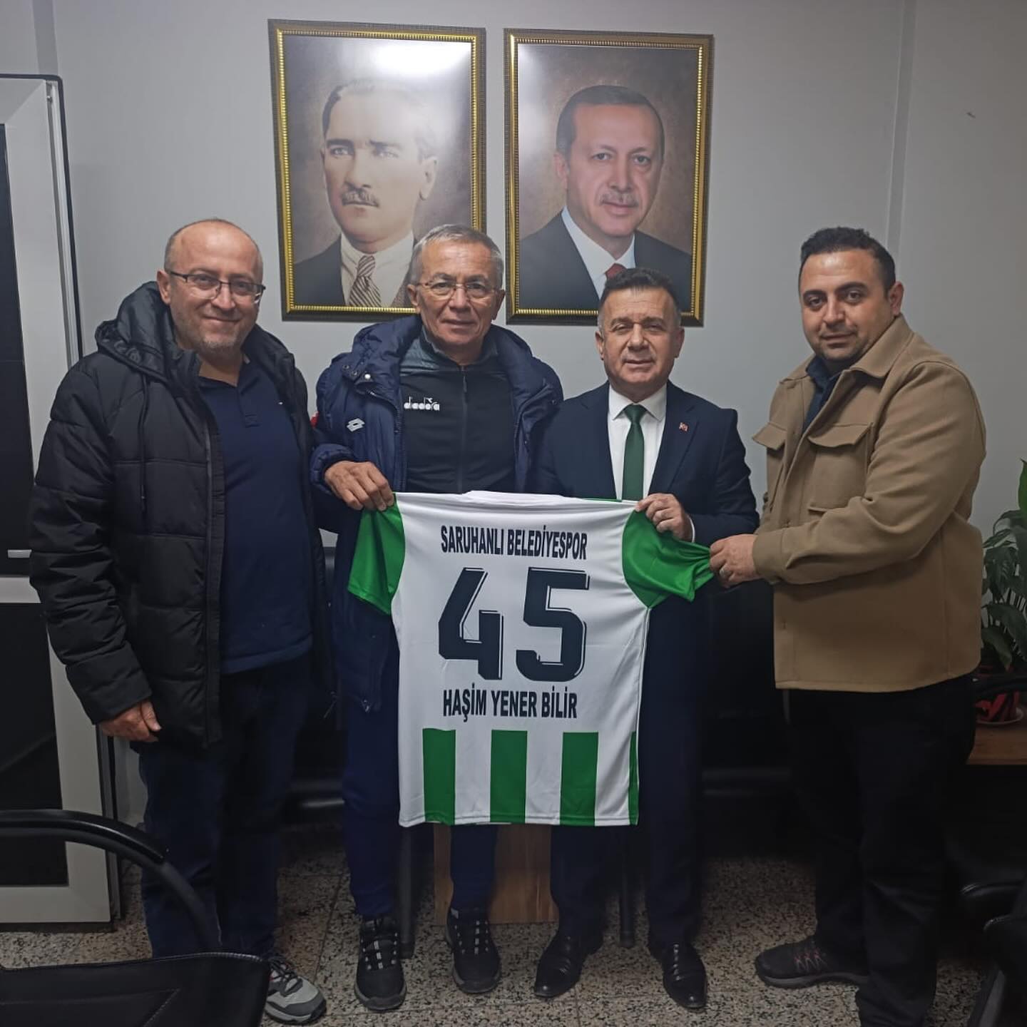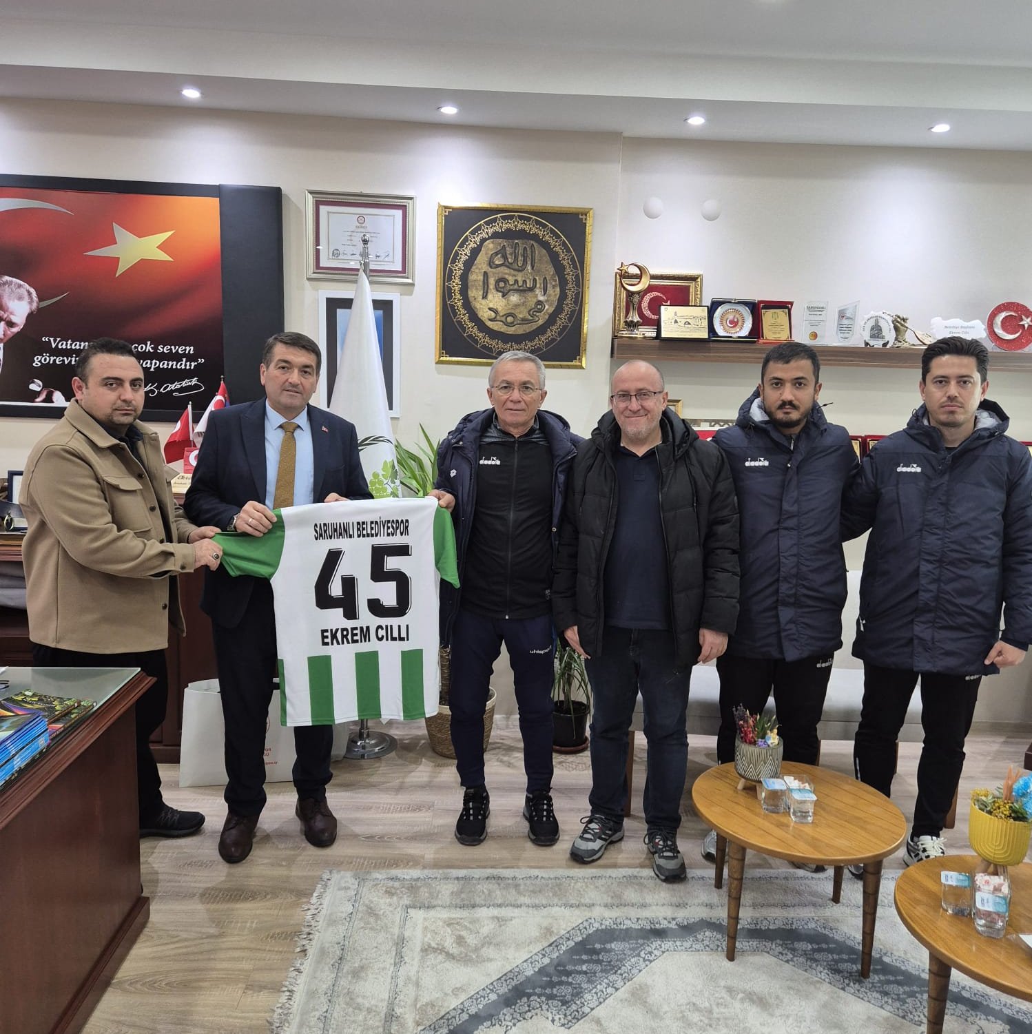Saruhanlı Belediyespor ekibi, Belediye Başkanı Ekrem Cıllı’yı makamında ziyaret ederek kulüp faaliyetleri hakkında bilgilendirmede bulundu. Ziyarette Spor İşleri Müdürü Fatih Korkut ve Belediyespor Antrenörü Fehmi Teker, takımı temsilen hazır bulundu. Ziyaret kapsamında, takımın yeni sezon forması Başkan Cıllı’ya hediye edildi.