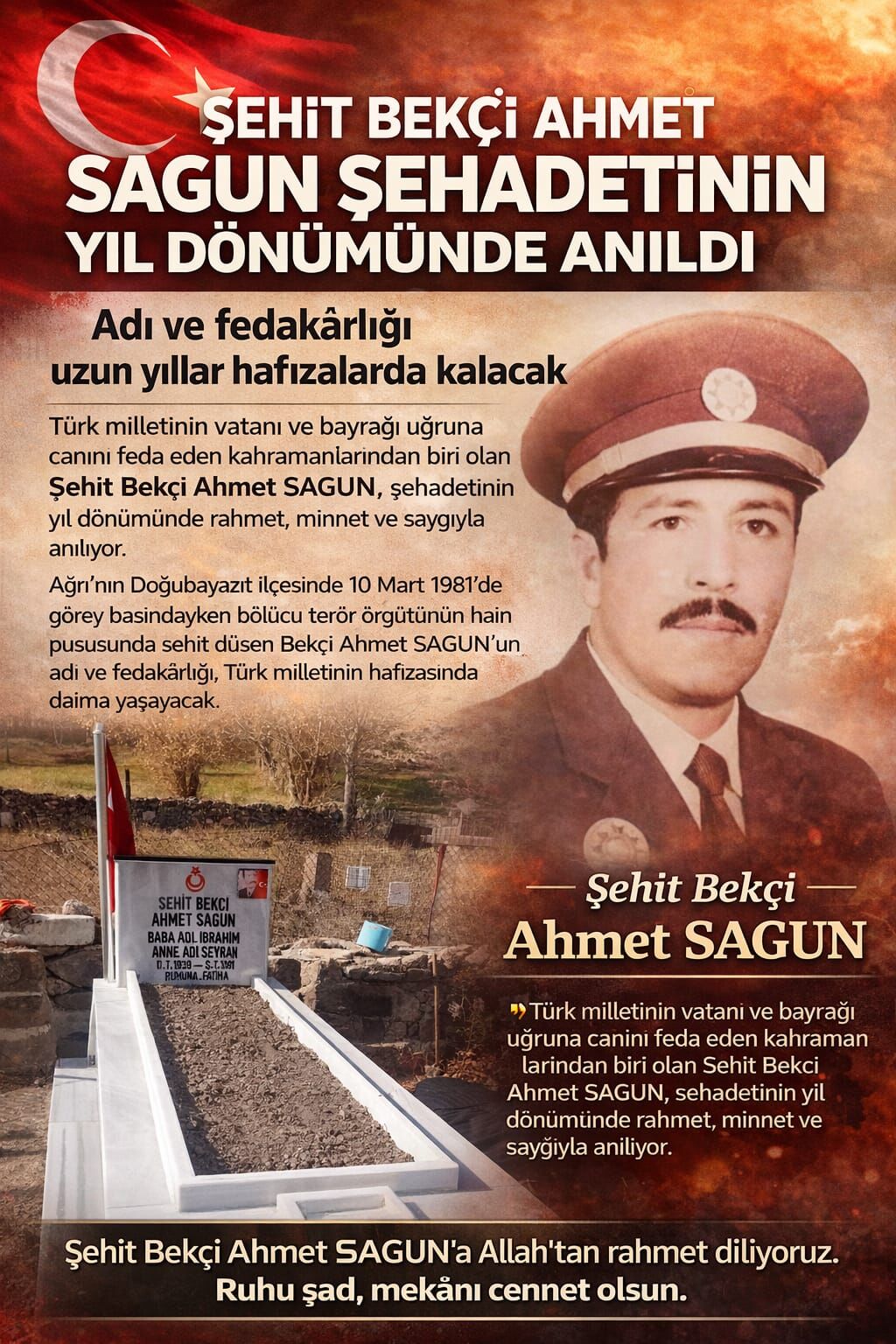 Ağrı İl Emniyet Müdürlüğü kadrosunda görevliyken 10 Mart 1981 tarihinde bölücü terör örgütü tarafından kurulan hain pusuda şehit olan kahraman Bekçi Ahmet Sagun için anma mesajları yayımlandı. Vatanın bölünmez bütünlüğü uğruna canını feda eden Sagun, fedakarlığı ve cesaretiyle Türk milletinin gönlünde yaşamaya devam ediyor.