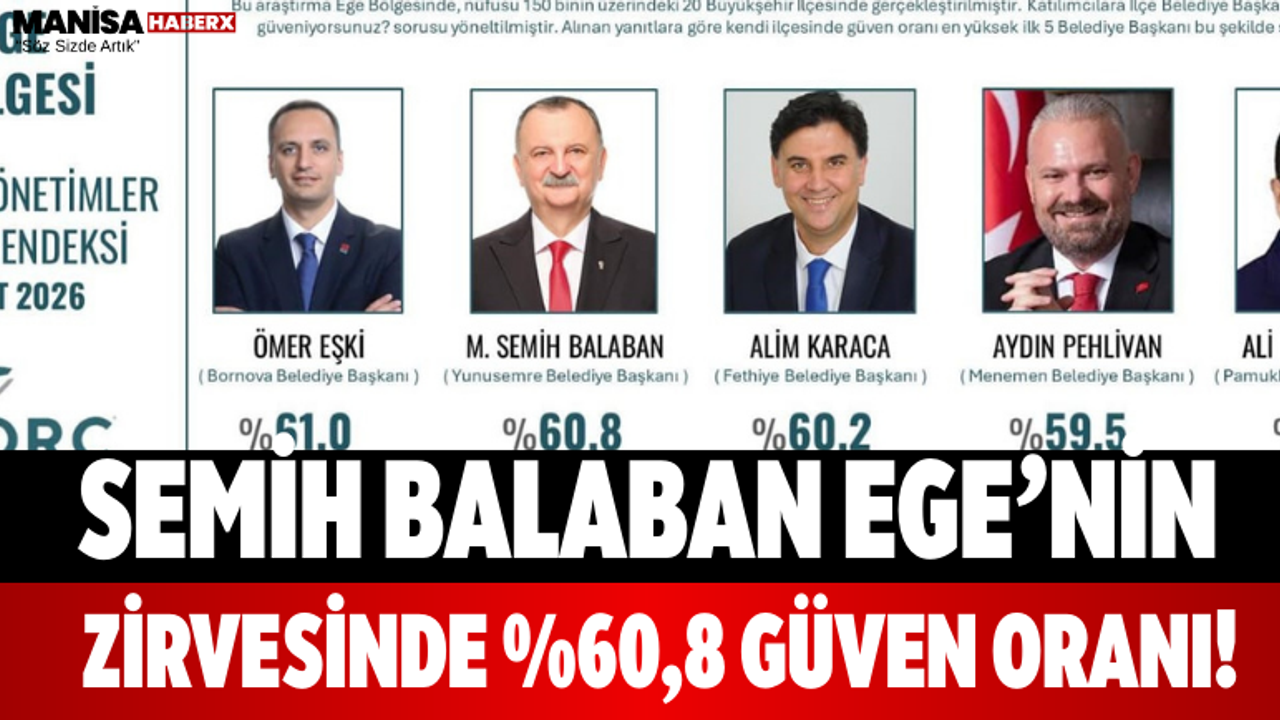 ORC Araştırma şirketi tarafından yayınlanan "Yerel Yönetimler Güven Endeksi - Mart 2026" araştırması, Ege Bölgesi'ndeki belediye başkanlarına yönelik vatandaş algısını ortaya koydu. Ege Bölgesi’nde nüfusu 150 binin üzerindeki 20 büyükşehir ilçesinde gerçekleştirilen dev ankette, Yunusemre Belediye Başkanı Semih Balaban, halkın büyük teveccühünü kazanarak listenin ikinci sırasına yerleşti.