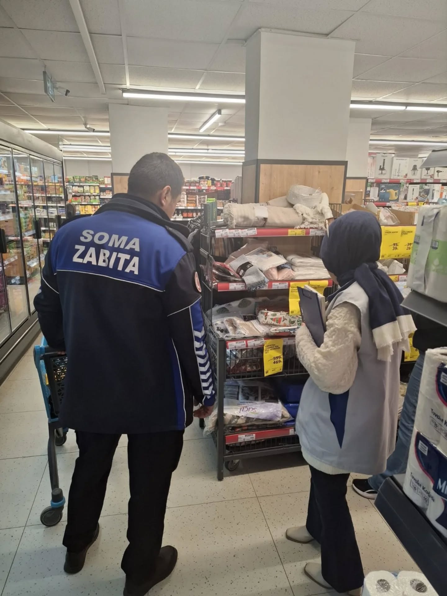 2026 yılına sayılı günler kala Soma Belediyesi Zabıta Müdürlüğü ekipleri, 2025 yılının son denetimlerini gerçekleştirdi. Denetimler kapsamında market ve satış noktalarında raf ve kasa fiyat etiketleri ile ürünlerin son tüketim tarihleri kontrol edildi.