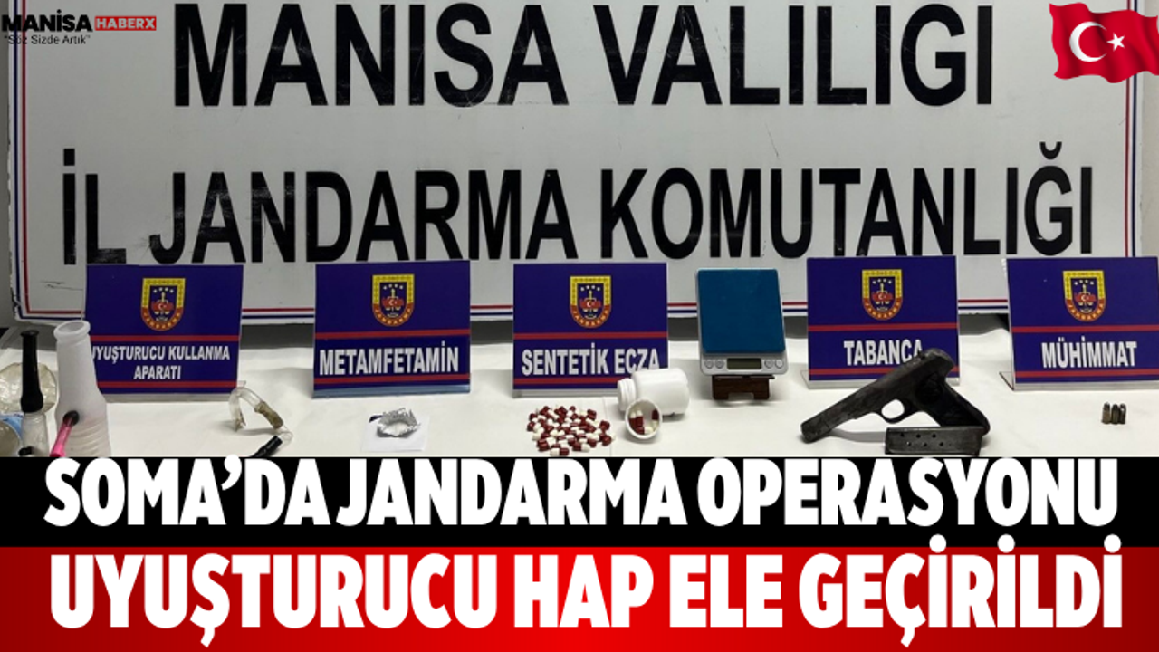 Manisa’nın Soma ilçesinde jandarma ekipleri tarafından düzenlenen operasyonda bir evde yapılan aramada sentetik uyuşturucu haplar ele geçirildi. Olayla ilgili olarak 26 yaşındaki bir şüpheli gözaltına alındı.