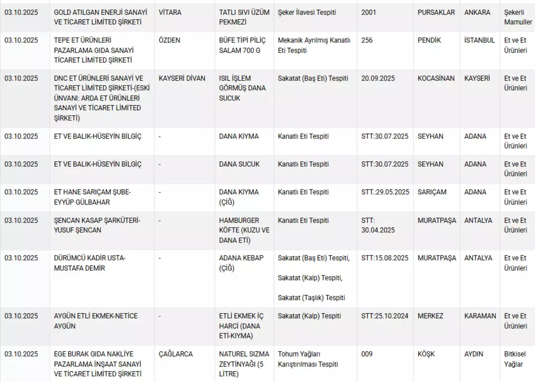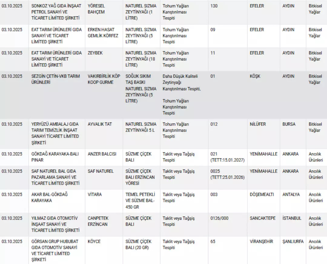 Bakanlık, listede yer alan diğer ürünleri ve firmaları da yayımlayarak vatandaşları uyarıyor. Denetimler, gıda güvenliği ve halk sağlığının korunması amacıyla sürekli olarak devam ediyor.