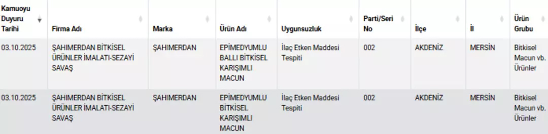 Mersin’in Akdeniz ilçesinde faaliyet gösteren Şahımerdan firmasına ait Şahımerdan markalı Epimedyumlu Ballı Bitkisel Karışımlı Macun ve Epimedyumlu Bitkisel Karışımlı Macun ürünlerinde ilaç etken maddesi tespit edildi. Bakanlık, bu ürünleri sağlığı tehlikeye atacak gıda olarak sınıflandırdı.