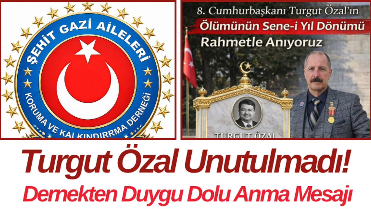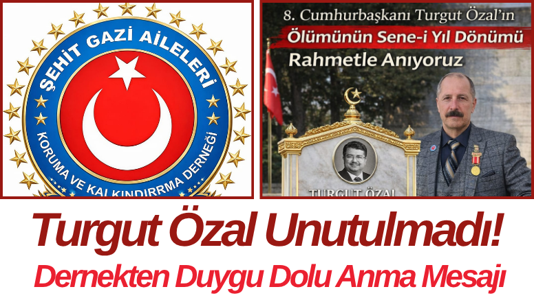 Şehit Gazi Aileleri Koruma ve Kalkındırma Derneği Genel Başkanı İbrahim Sagun tarafından yayımlanan mesajda, Türkiye Cumhuriyeti’nin 8. Cumhurbaşkanı Turgut Özal, vefatının sene-i devriyesinde rahmet, minnet ve saygıyla anıldı. Mesajda, Özal’ın Türk milletinin hafızasında derin izler bırakan bir lider olduğu vurgulandı.