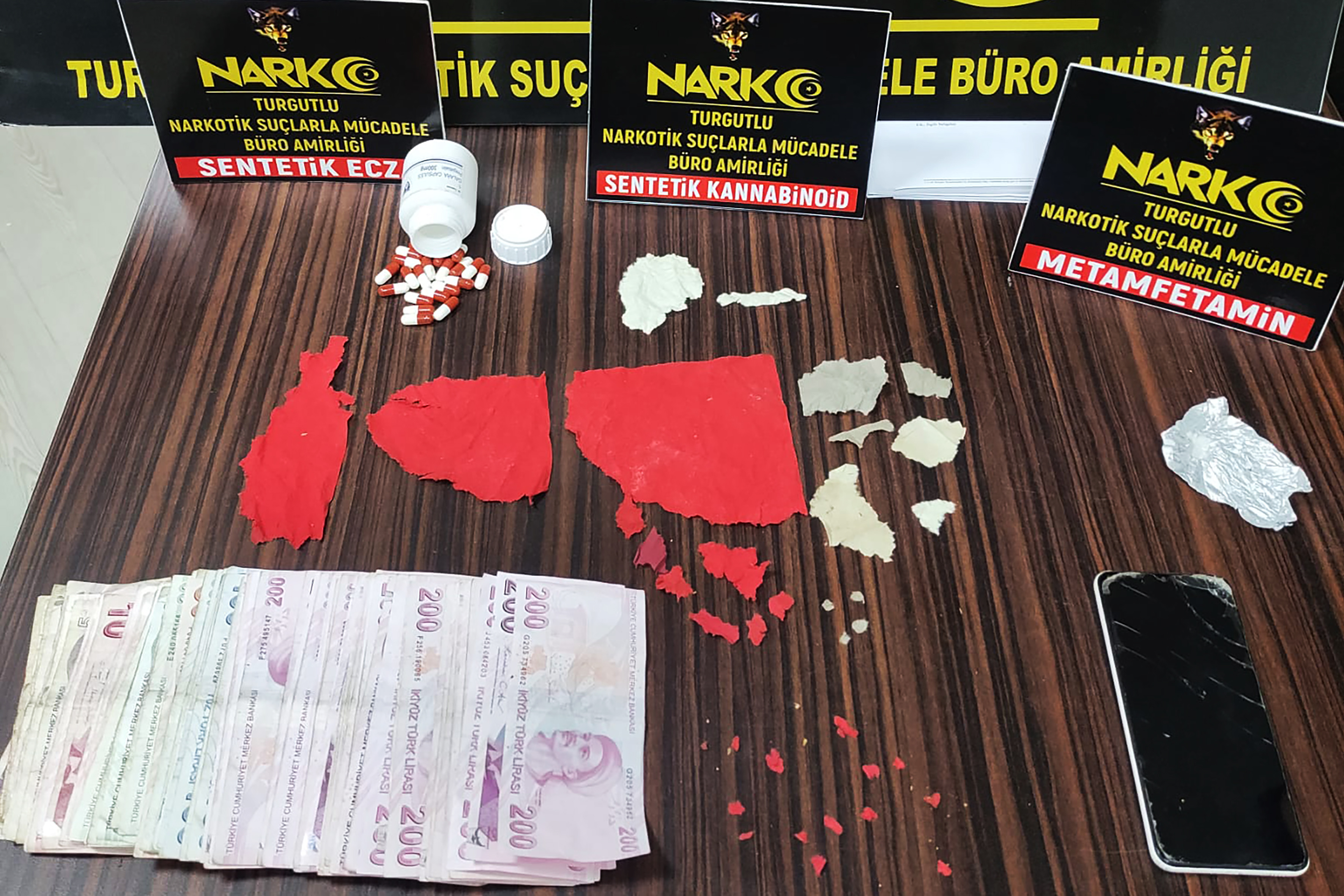Manisa İl Emniyet Müdürlüğü ekipleri, uyuşturucuyla mücadele kapsamında Turgutlu ilçesinde bir adrese operasyon düzenledi. Yapılan aramalarda 1408 içimlik sentetik uyuşturucu, 21 adet sentetik ecza hap ve uyuşturucu ticaretinden elde edildiği değerlendirilen 9 bin 640 lira nakit para ele geçirildi.