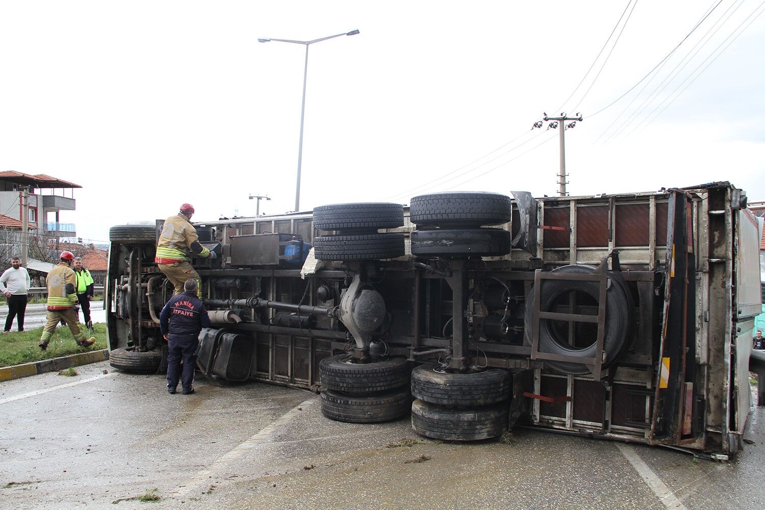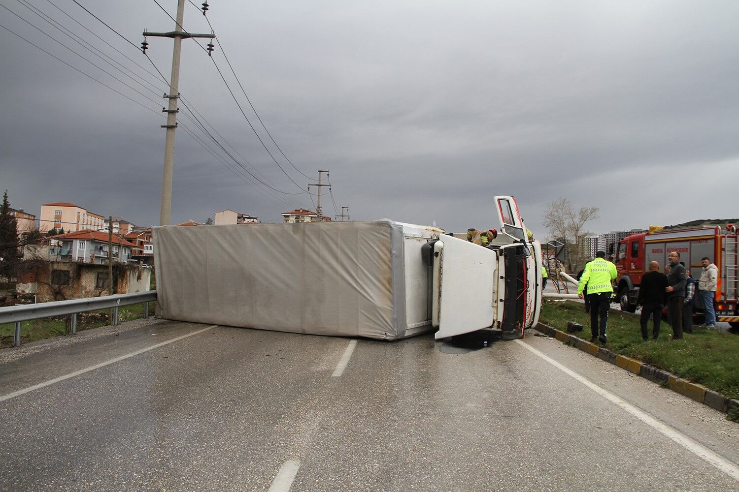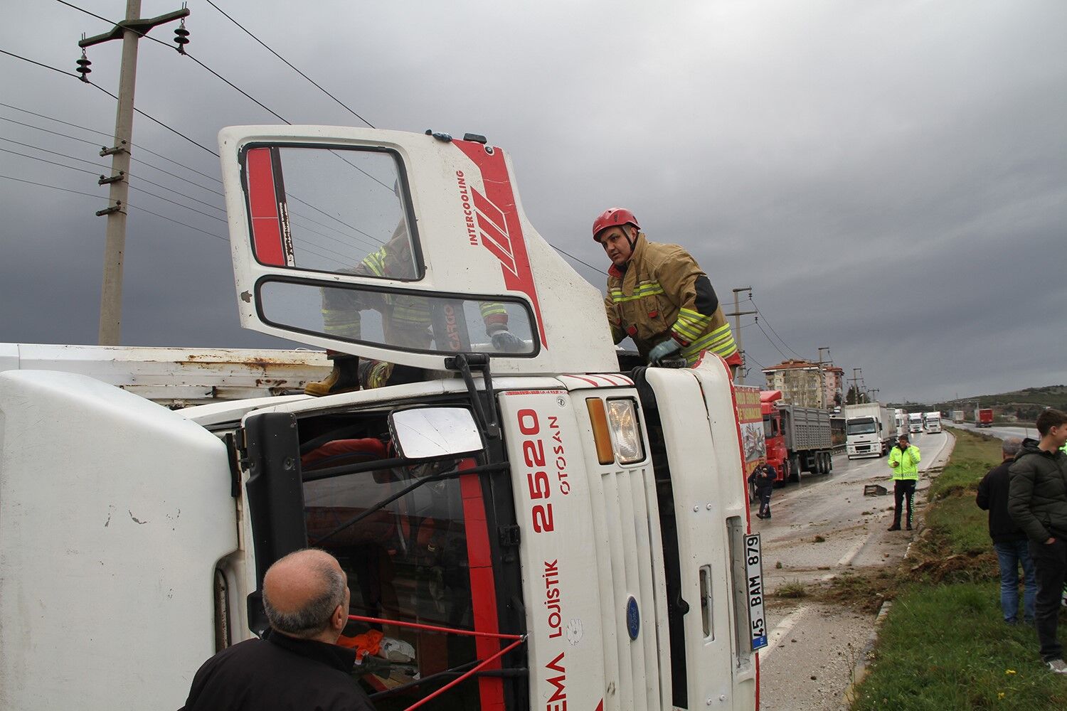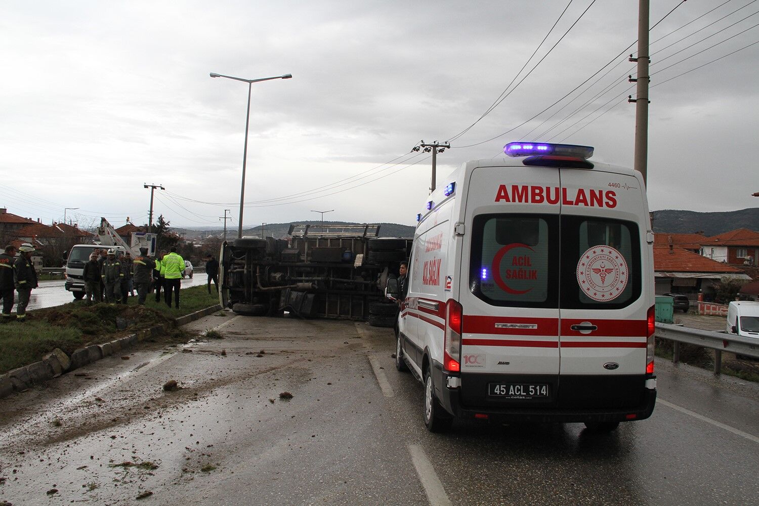 Edinilen bilgilere göre, Ümit İdem yönetimindeki 45 BAM 879 plakalı kamyonet, yağışın etkisiyle kayganlaşan yolda kontrolden çıkarak devrildi. Araç, yolda yan yatarak durabildi.