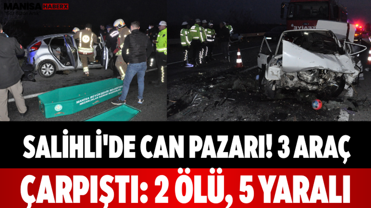 Manisa’nın Salihli ilçesinde 3 otomobilin karıştığı zincirleme kazada 2 kişi hayatını kaybetti, 2’si çocuk 5 kişi yaralandı.