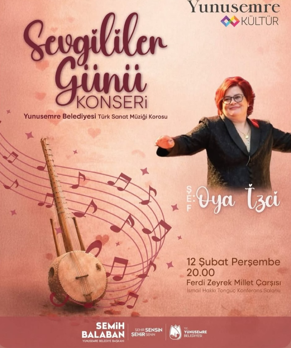 Yunusemre Belediyesi, 14 Şubat Sevgililer Günü kapsamında özel bir konser programı düzenliyor. Etkinlik, 12 Şubat tarihinde Ferdi Zeyrek Millet Çarşısı İsmail Hakkı Tonguç Konferans Salonu’nda gerçekleştirilecek. Saat 20.00’de başlayacak konser programında, Türk Sanat Müziği’nin seçkin eserleri seslendirilecek.