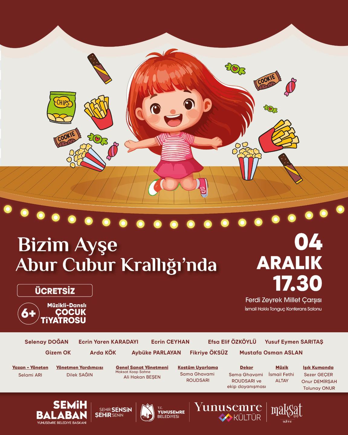 Yunusemre Belediyesi, çocuklara hem eğlenceli vakit geçirecekleri hem de sağlıklı beslenmenin önemini anlatacak yeni bir kültür etkinliği sunuyor. “Bizim Ayşe Abur Cubur Krallığı’nda” adlı çocuk tiyatrosu, Maksat Sahne iş birliğiyle ve Yunusemre Kültür organizasyonunda minik izleyicilerle bir araya geliyor. Etkinlik, 4 Aralık Perşembe günü saat 17.30’da Ferdi Zeyrek Millet Çarşısı İsmail Hakkı Tonguç Konferans Salonu’nda gerçekleştirilecek. Program tamamen ücretsiz olarak düzenleniyor.